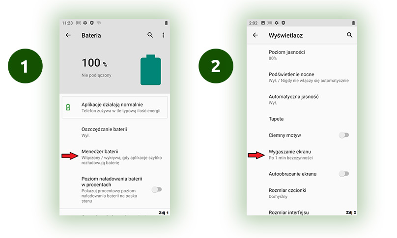 wyłączenie wygaszania ekranu urządzenia (Zdj 1) oraz