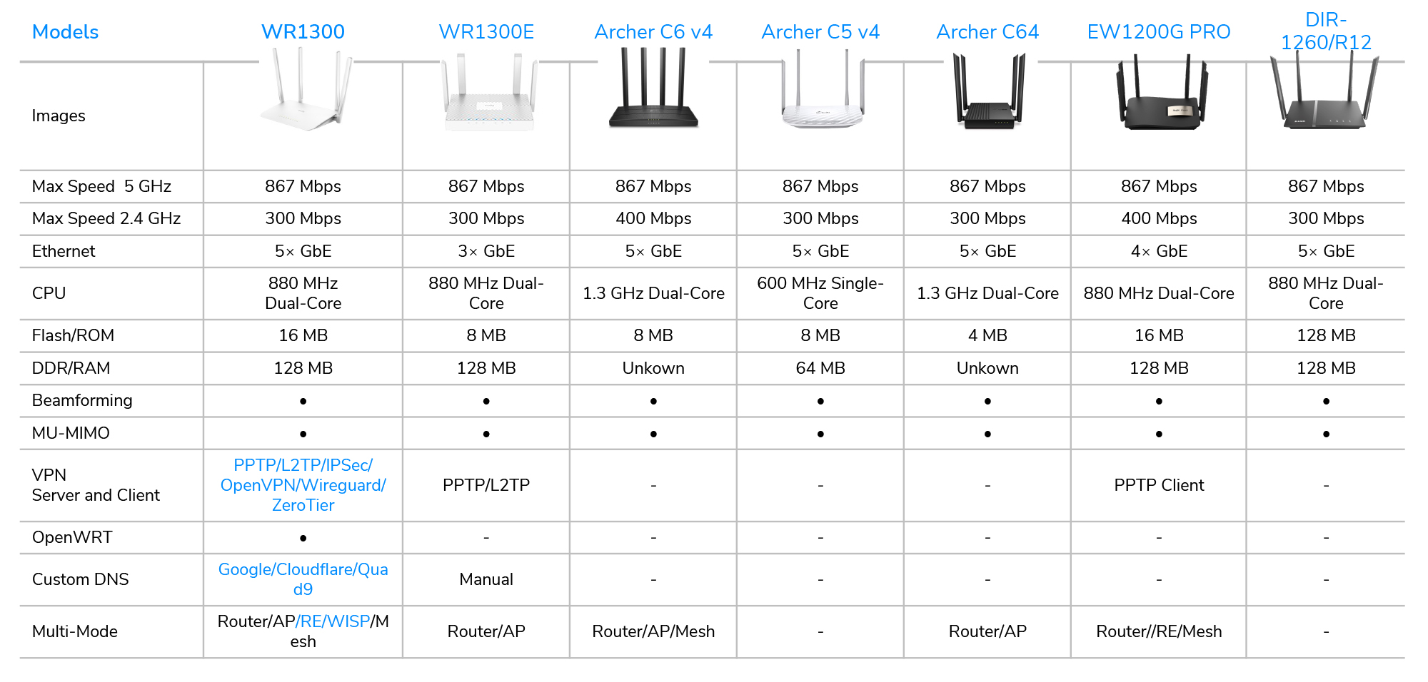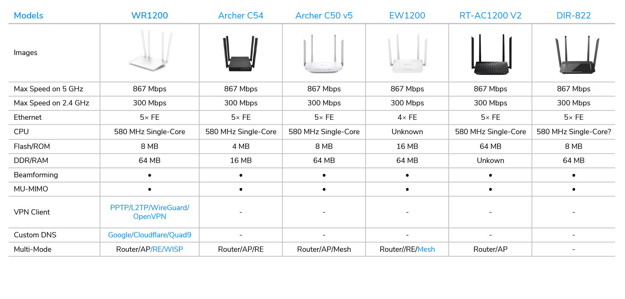 Router Domowy Mesh Repeater WISP Access Point 1200mb/s Open WRT VPN Dual Band 4x5dBi Cudy WR1300 vs. TP-Link Archer C6 v4, TP-Link Archer C5 v4, TP-Link Archer C64, Ruijie Rejee EW1200G PRO i D-LINK DIR-1260/R12