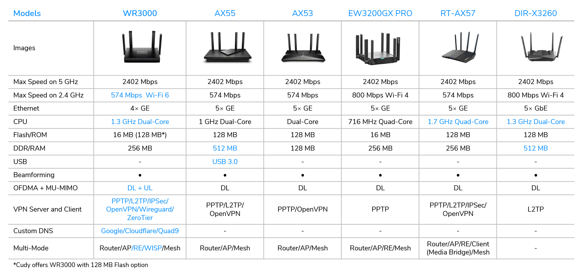 Szybki Router Wi-Fi 6 Mesh 3000mb/s Open WRT Dual Band Cudy WR3000 vs. TP-Link AX55, TP-Link AX53, Ruijie Rejee EW3200GX PRO, ASUS RT-AX57 i D-LINK DIR-X3260