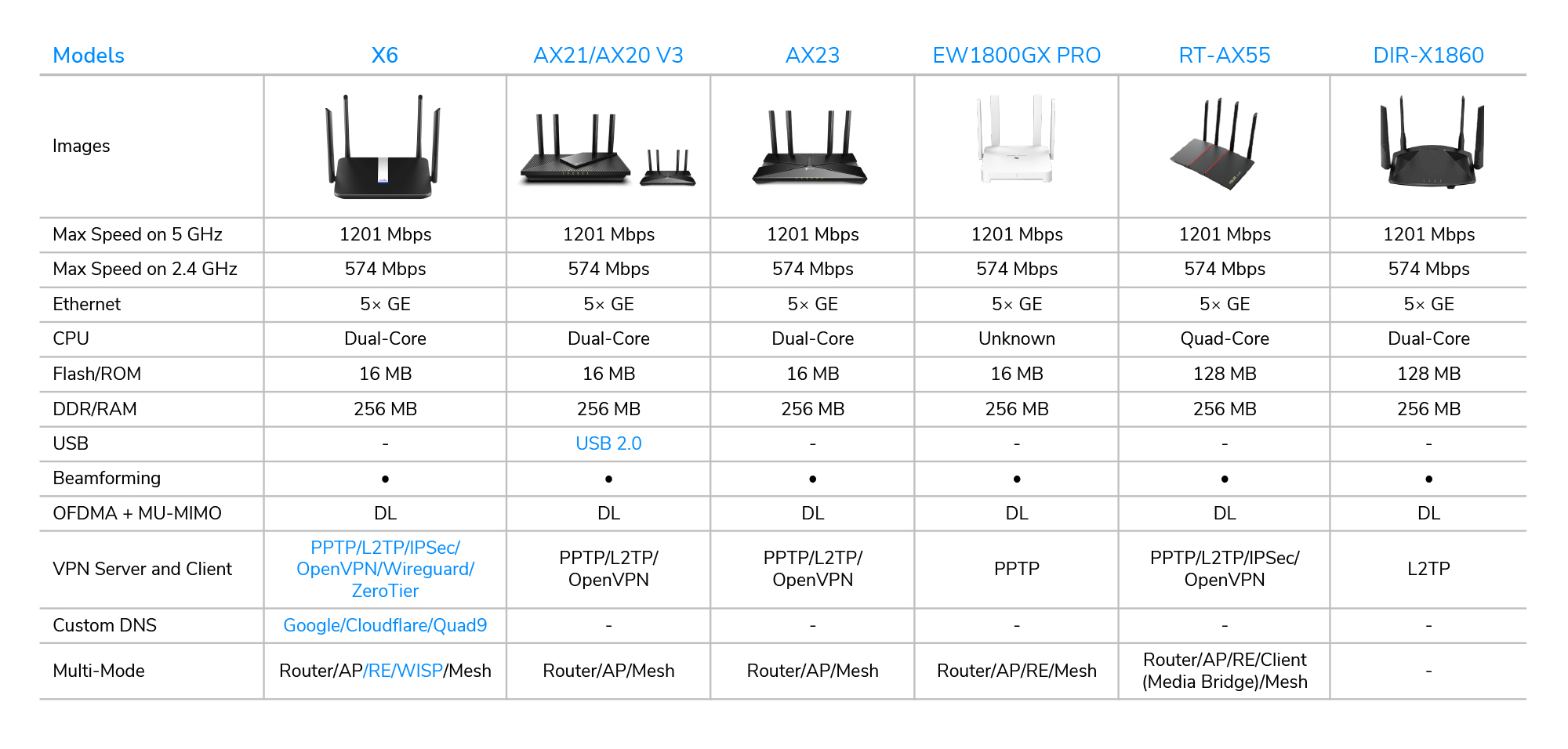 Router Wi-Fi 6 AX1800 Mesh Open WRT Dual Band Smart Wi-Fi 6 Cudy X6 4x5Dbi vs. TP-Link AX21/AX20 V3, TP-Link AX23, Ruijie Rejee EW1800GX PRO, ASUS RT-AX55 i D-LINK DIR-X1860