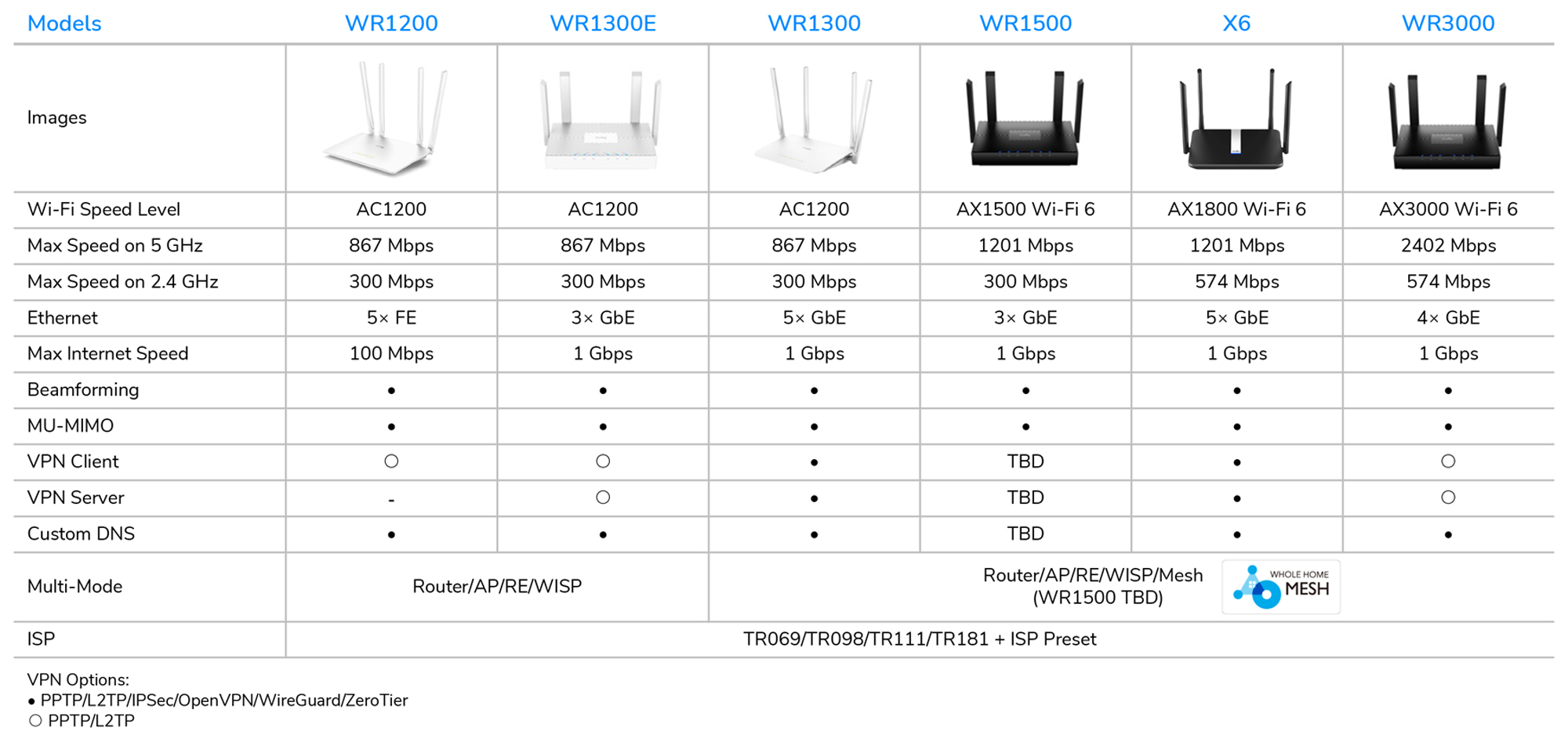 Model WR1200 oferuje stabilne połączenia, doskonałą prędkość i szeroki zasięg Wi-Fi, jest idealny do zastosowań domowych oraz kusi użytkowników swoją ceną. WR1300 zapewnia dodatkowo zaawansowane funkcje, takie jak server VPN, które zwiększają bezpieczeństwo sieci bezprzewodowej. Natomiast model WR3000 charakteryzuje się niezwykłą prędkością w pasmach 5Ghz i 2,4Ghz. X6 natomiast łączy w sobie funkcje wysokowydajnego routera, punktu dostępowego, repeatera i sieci mesh, zapewniając elastyczność i lepsze pokrycie sygnałem Wi-Fi.