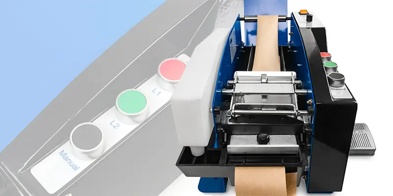 Drugą z maszyn do taśm podgumowanych jest dyspenser półautomatyczny. Jest to rozwiązanie, które pozwoli na częściową automatyzację procesu opakowywania produktu. Dzięki przyciskom funkcyjnym możemy w prosty sposób ustalić pożądane ilości, które ma odcinać urządzenie lub manualnie ustalić długość odcinka. Urządzenie jest zasilane z sieci elektrycznej 230 V — wystarczy wpiąć je do dowolnego gniazda elektrycznego. Dyspenser posiada regulację poziomu nawilżenia taśmy w 3 poziomach. Dodatkowo dyspenser można obsługiwać przy pomocy pedała nożnego, który podaje automatycznie taśmę o ustalonej wcześniej długości na pierwszym z przycisków. Dzięki swojej szybkości jest w stanie w dużym stopniu usprawnić i przyśpieszyć znacząco pracę na stanowisku. Produkt jest idealny dla firm, w których występują powtarzalne długości kartonów i potrzebujemy często danych ustawionych z góry długości taśm. Sprawdzi się w większych firmach produkcyjnych i handlowych.
