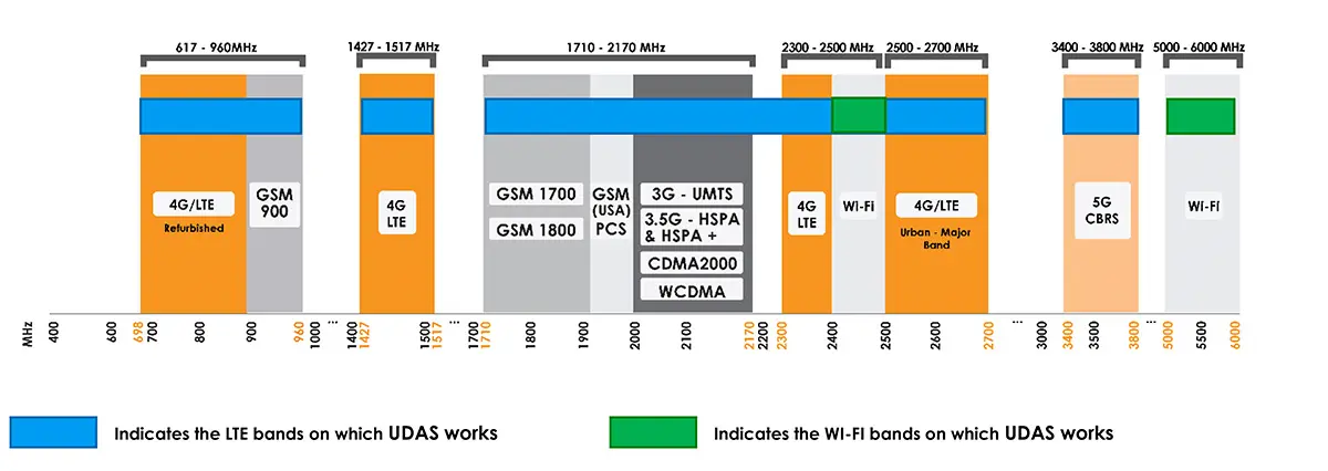 UDAS to antena dookólna działająca w szerokim zakresie częstotliwości. Obsługiwane pasma częstotliwości: 617–960 MHz, 1427-1517 MHz, 1710-2700 MHz, 3400-3800 MHz oraz pasma częstotliwości Wi-Fi 2400-2500 MHz i 5000-6000 MHz