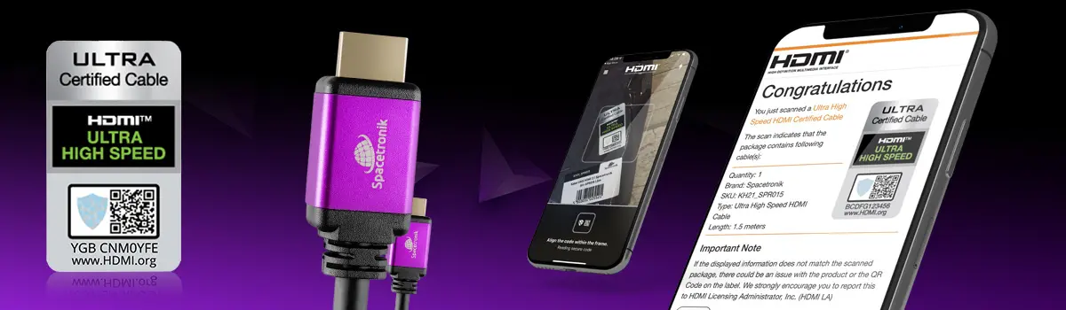 Spacetronik już od dłuższego czasu posiada w swojej ofercie kable HDMI w najnowszym standardzie. Istotnym faktem jest, że kable HDMI 2.1 o długości 0,5 m, 1,5 m, 2 m, 3 m, 4 m, 5 m posiadają oficjalny certyfikat. Daje on 100% gwarancję obsługi pełnej przepustowości HDMI dla wersji 2.1. Można dokonać weryfikacji autentyczności certyfikacji. Należy odszukać na opakowaniu hologram "Ultra Certified Cable" oraz kod QR, który następnie należy zeskanować za pomocą smartfona. Do sprawdzenia posłuży oficjalna appka HDMI, która jest dostępna dla dwóch wiodących systemów mobilnych - Android & iOS.