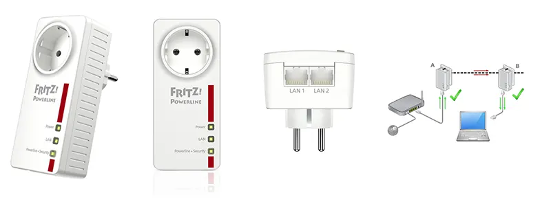 Przykład: W naszym domu na parterze mamy router z modemem, który jest podstawowym źródłem Internetu, a chcemy aby sieć dotarła także na trzecie piętro bez konieczności prowadzenia kabla sieciowego. (sieć bezprzewodowa dociera najdalej na pierwsze piętro, a nie chcemy się bawić w żadne repeatery). Podłączamy do gniazdka elektrycznego jeden transmiter PLC Powerline. Kolejnie łączymy go z routerem za pomocą kabla Ethernet (RJ45). Kilka schodów w górę i jesteśmy na trzecim piętrze - tutaj umieszczamy drugi transmiter Fritz! w wybranym przez nas gnieździe elektrycznym. Voilà! Od teraz cieszymy się Internetem "płynącym" z prądem w sieci elektrycznej. Co dalej? Do transmitera możemy podłączyć komputer, konsolę, telewizor, itd. Możecie w ten sposób także rozszerzyć Waszą sieć bezprzewodową, podłączając chociażby punkt dostępu, aby zapewnić szybki Internet na tym piętrze.