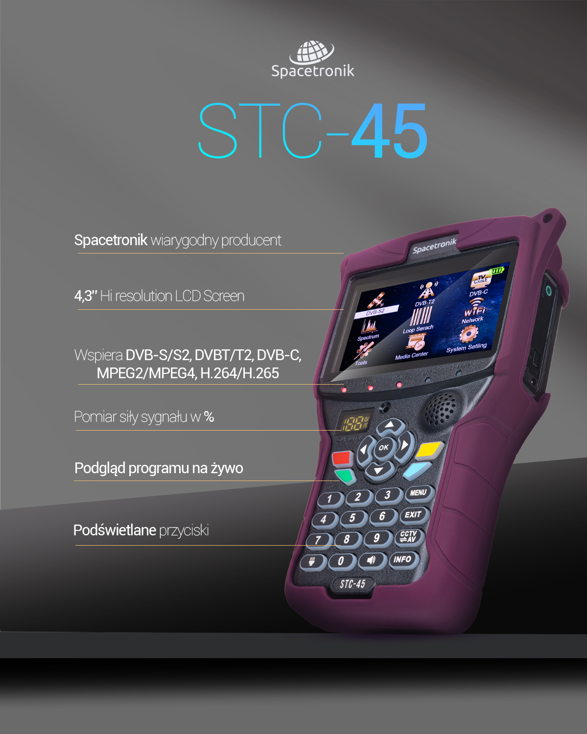 Miernik Spacetronik STC-23 typu COMBO jest miernikiem przeznaczonym do pomiarów sygnałów telewizji satelitarnej DVB-S/S2, ale także anten naziemnych DVB-T/T2 oraz sygnału telewizji kablowej DVB-C. Pomiar sygnału siły i jakości w %, pomiar BER, PWR, SNR oraz analizatora widma.