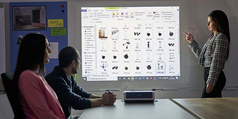 tablica może posłużyć jako ekran projekcyjny. Otrzymujesz produkt dwa w jednym — bez konieczności rozwijania i montowania ekranu wyświetlisz prezentację multimedialną do zaprezentowania swojego pomysłu, a następnie zapiszesz spostrzeżenia i uwagi od kolegów z zespołu.