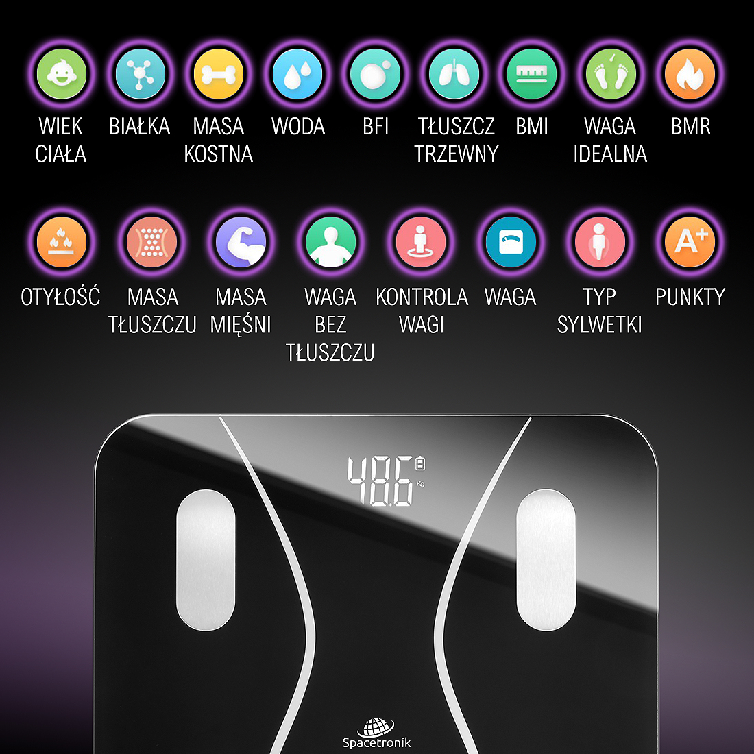 Spacetronik SL-BS01 to nie tylko estetyczny dodatek do naszej łazienki, ale przede wszystkim zaawansowane narzędzie do monitorowania zdrowia i postępów w dążeniu do wymarzonej sylwetki. Dzięki wbudowanym czujnikom, waga pozwala na uzyskanie aż 17 różnych pomiarów, takich jak waga, BMI, BMR, BFI, wiek ciała, masa kostna, nawodnienie czy poziom tłuszczu trzewnego. Wszystkie te parametry pozwalają na kompleksowe spojrzenie na nasze zdrowie oraz na regularne kontrolowanie postępów.