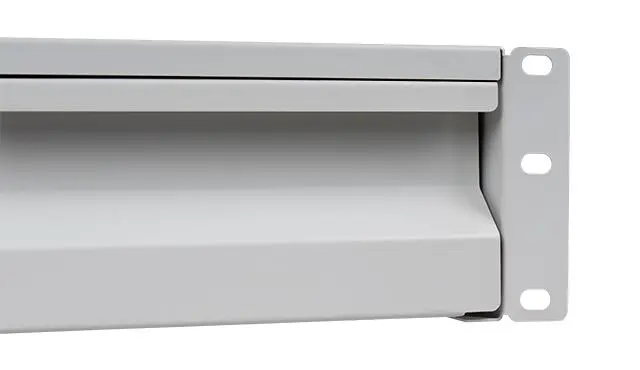 Szuflada mocowana 6-punktowo do pionowych szyn rackowych.