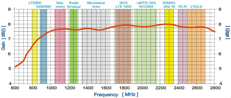 - Pasmo częstotliwości: LTE 800 (790-862 MHz), GSM 900 (880-960 MHz), DCS 1800 (1710-1880 MHz), UMTS (3G) (1920-2170 MHz), Wi-Fi (WLAN) ( 2401-2495 MHz) i LTE 2,6 GHz (2,5-2,7 GHz)
