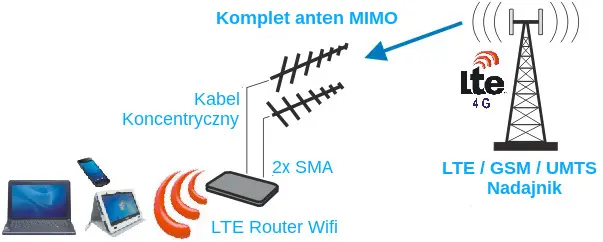 Zestaw antenowy obsługuje zakres częstotliwości od LTE 800 do LTE 2,6 GHz. Zestaw jest idealny aby podłączyć go do routera Wi-Fi lub modemu MiMo.