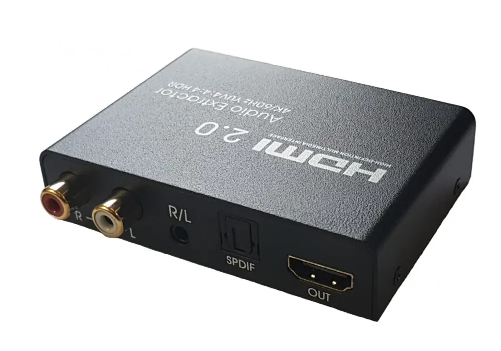 Extractor HDMI na HDMI + Audio (R/L+SPDIF) pozwala na podłączenie urządzenia wysyłającego sygnał audio i video (tuner, konsola, dvd, blu-ray) do telewizora kablem HDMI. Dodatkowo można wyodrębnić sygnał audio z urządzenia i przesłać go do amplitunera kina domowego lub innego tego typu urządzenia. Dzięki takiemu rozwiązaniu dźwięk będzie słyszalny standardowo z głośników telewizora i dodatkowo z drugiego źródła po włączeniu amplitunera. Ciekawe rozwiązanie gdy chcemy panować i sami decydować kiedy dźwięk ma być słyszalny z danego urządzenia. Mozliwośc przełączania wyjścia dźwieku 2.0 lub 5.1.