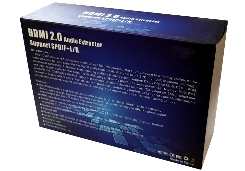 - Zgodny z HDMI2.0, HDCP2.2- Obsługa rozdzielczości Full HD 1080P, Full 3D, 4K * 2K przy 60 Hz, YUV 4: 4: 4 HDR