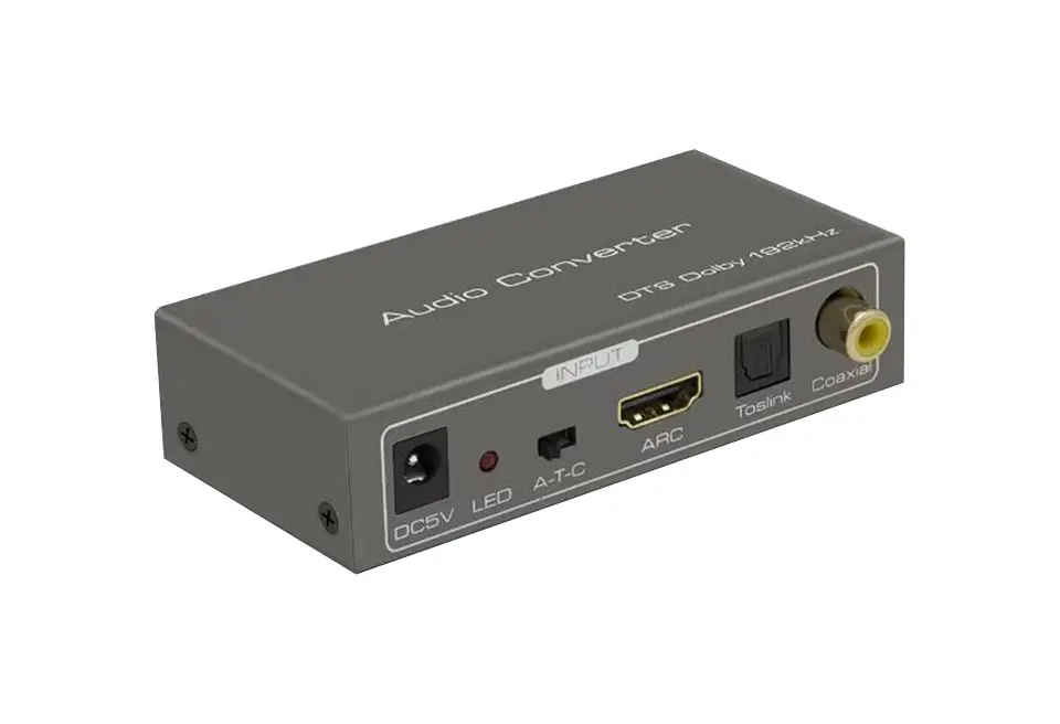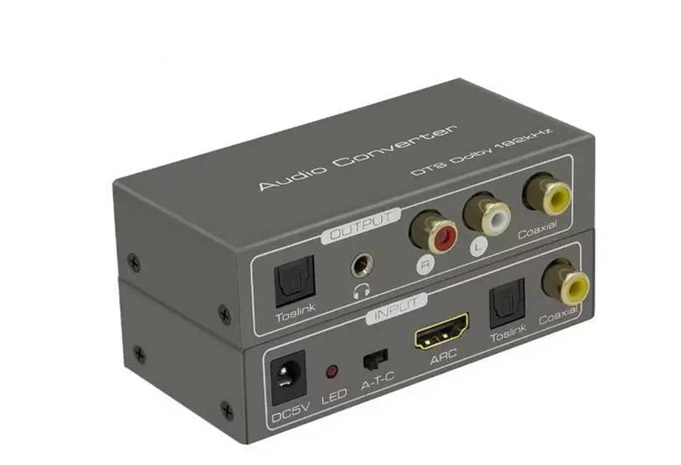 Extractor audio z HDMI, toslink i coaxial na analogowe audio L / R, coaxial, toslink i jack z mozliwością równoczesnego działania na wyjściu. Zastosowany przełącznik A-T-C pozwala na wybór z którego źródła ma być pobrany dźwięk i przekazany na wszystkie wyjścia jednocześnie. Konwerter jest niewielkich rozmiarów i łatwy do zainstalowania. Ciekawe rozwiązanie gdy chcemy panować i sami decydować kiedy dźwięk ma być słyszalny z danego urządzenia.