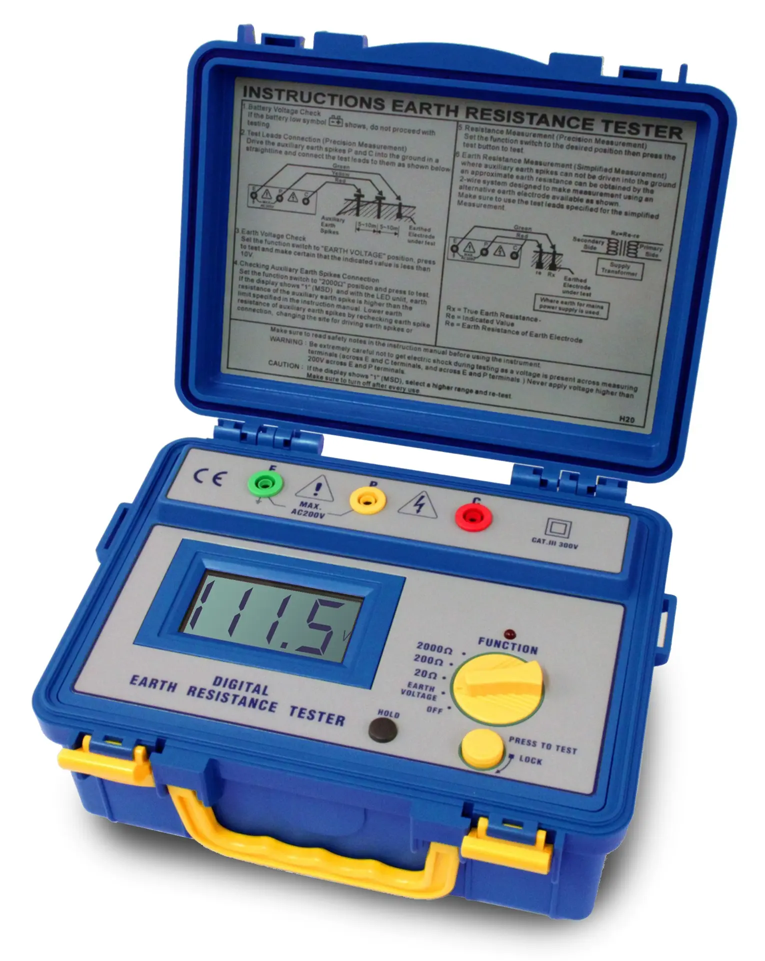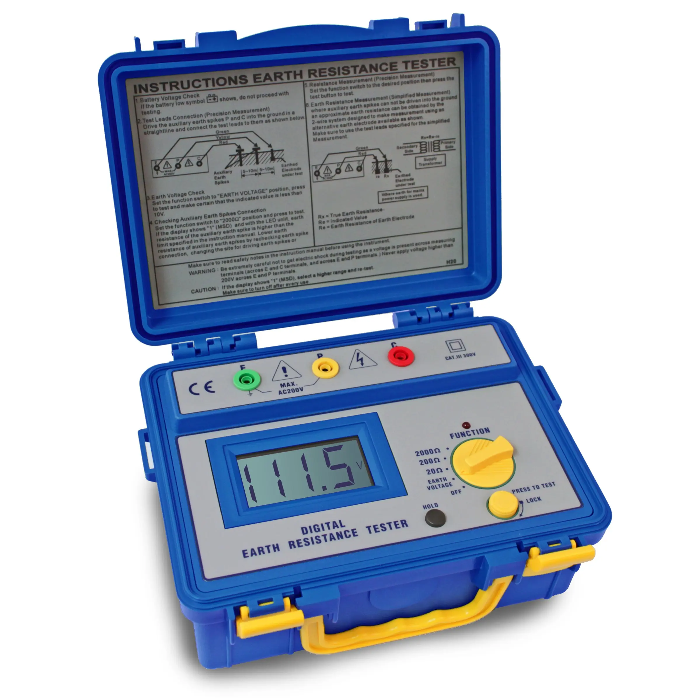 Wytrzymały, uszczelniony cyfrowy tester uziemienia jest zbudowany z pełną ochroną, której potrzebujesz do użytku na zewnątrz. Przyrząd nadaje się do testowania pojedynczych uziemień, takich jak przewody odgromowe i inne małe systemy uziemiające zgodnie z VDE 0413. Można również mierzyć rezystancję przewodów, takich jak ciągłość i złącza przewodów. Pomiar dwóch terminali, który zmniejsza dokładność, można również wykonać przez zwarcie zacisków P i C. Posiada zaawansowaną konstrukcję obwodu, która pozwala przyrządowi działać przy minimalnym wpływie napięcia ziemi i rezystancji uziemienia kolców pomocniczych. Kalibracja przyrządu jest wykonywana za pomocą dołączonych przewodów pomiarowych. Częstotliwość testowania 820 Hz została wybrana, aby uniknąć prądów błądzących przy częstotliwościach mocy i ich harmonicznych oraz z wbudowanym filtrem do odrzucania niepożądanych sygnałów.