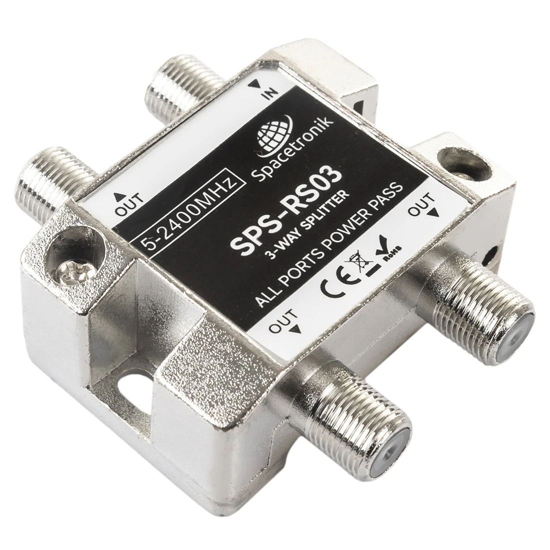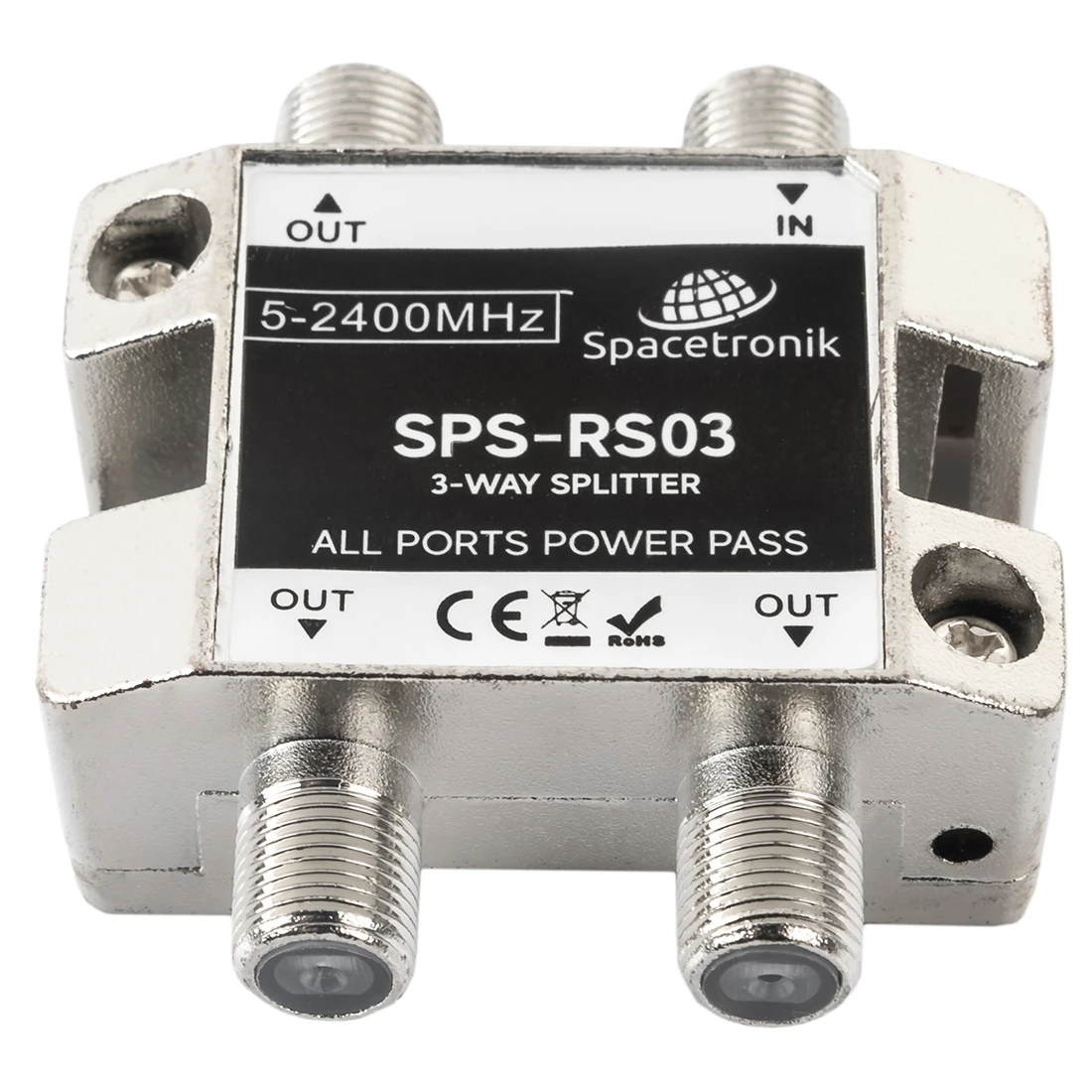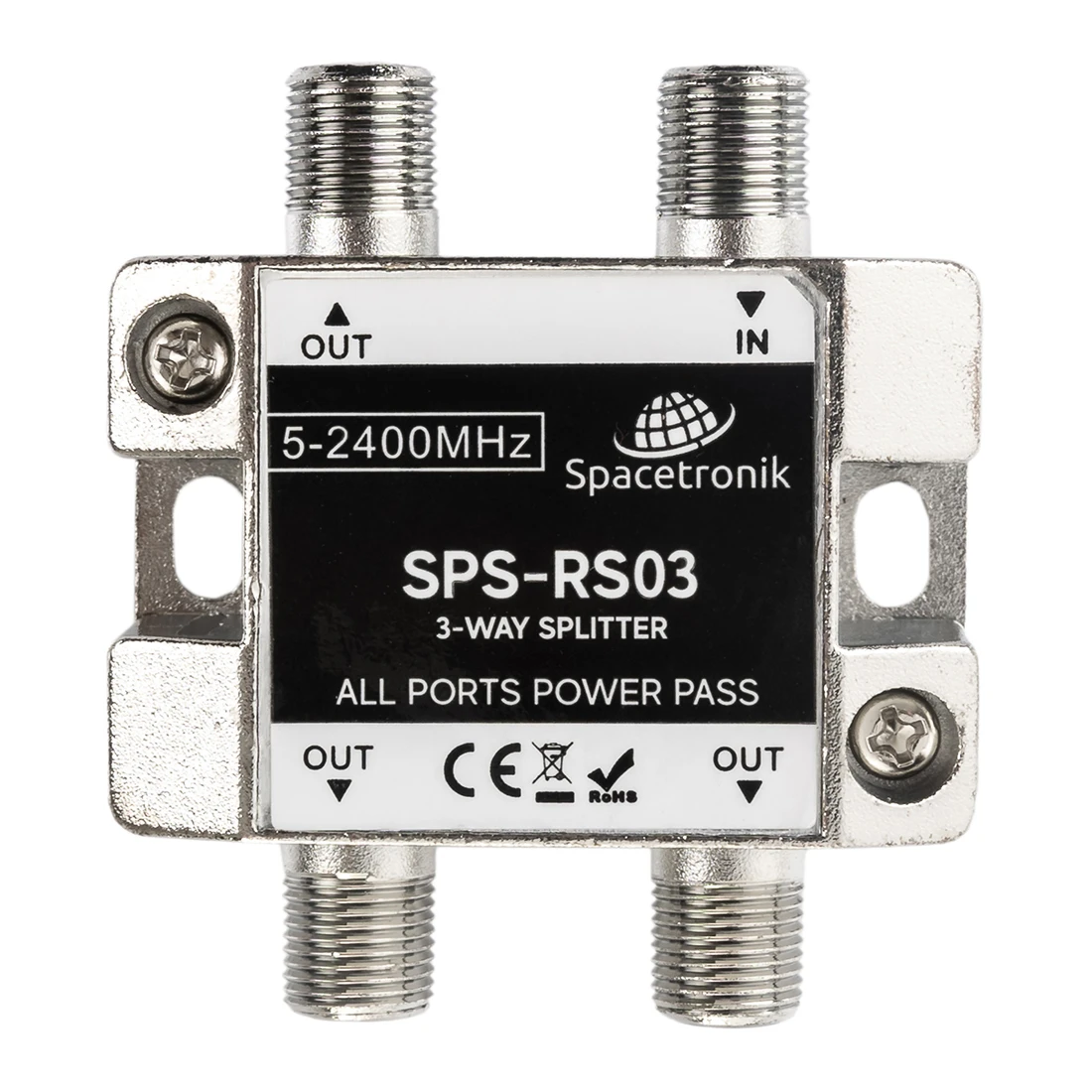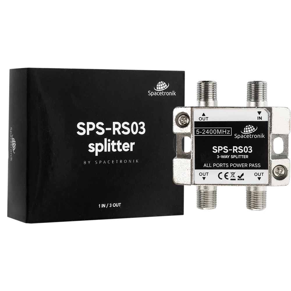 Wysokiej jakości małostratny ekranowany splitter, (rozgałęźnik sygnału telewizyjnego), posiadający 1 wejście i 3 wyjścia. Spacetronik SPS-RS03 pracuje w zakresie 5-2400 MHz. Wszystkie porty: Złącza typu "F".