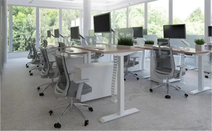 Stelaż jest wyposażony w pojedynczy silnik zapewniający sprawną i płynną zmianę wysokości blatu. Regulacja daje poczucie komfortu i możliwość dopasowania indywidualnych potrzeb pracownika, a także może wpłynąć na efektywność pracy.