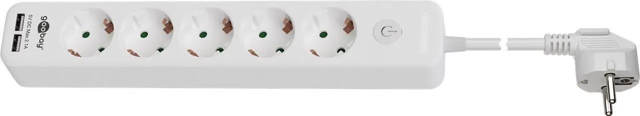 Listwa zasilająca wyposażona w pięć gniazd prądowych 230V oraz dwa porty USB 5V/2,1A. Z ochroną przed porażeniem i wyłącznikiem.