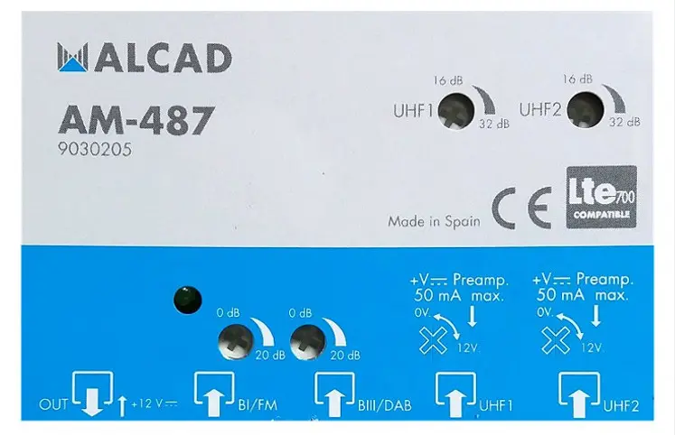 Model AM-487 sumuje sygnały typu: 2xUHF+VHF+FM. Całość jest podawana dalej na jednym przewodzie koncentrycznym 75 Ohm.