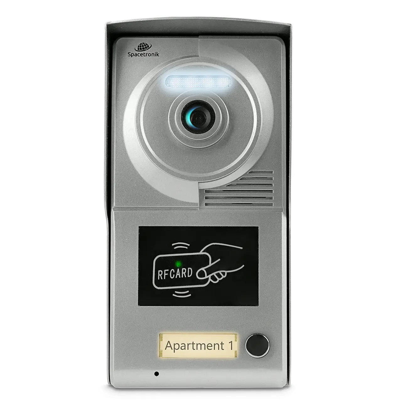 Jednoabonentowy zestaw wideodomofonu z wbudowanym czytnikiem zbliżeniowym RFiD umożliwiającym otwieranie wejścia za pomocą karty lub breloków. Panel wyróżnia się estetycznie wykonaną wandaloodporną obudową ze stopu aluminium, w którą wkomponowany został czytnik zbliżeniowy oraz podświetlany szyld. Do każdego wideodomofonu można dołożyć dodatkowe breloki lub karty, a odbywa się to za pomocą załączonej karty Master. Podświetlenie nocne LED pozwala na komfortowe korzystanie z urządzenia w warunkach niedostatecznej widoczności. W zseatwie znajduje się monitor przeznaczony do pracy w systemie wideodomofonowym dwużyłowym Spacetronik DiO. Wyposażony w kolorowy ekran o przekątnej 4,3″ TFT, monitor posiada wszystkie niezbędne funkcje cechujące urządzenia najwyższej klasy. Produkt świetnie nadaje się do zastosowań dla domów jednorodzinnych i małych firm.