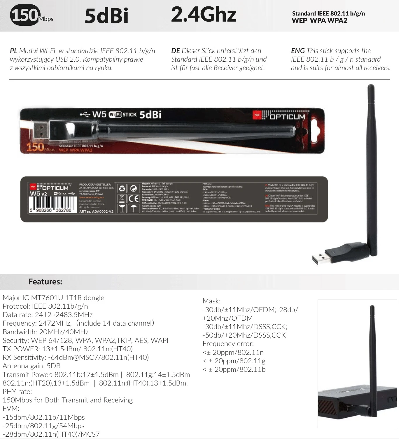 Moduł Wi-Fi w standardzie IEEE 802.11 b/g/n wykorzystujący USB 2.0.