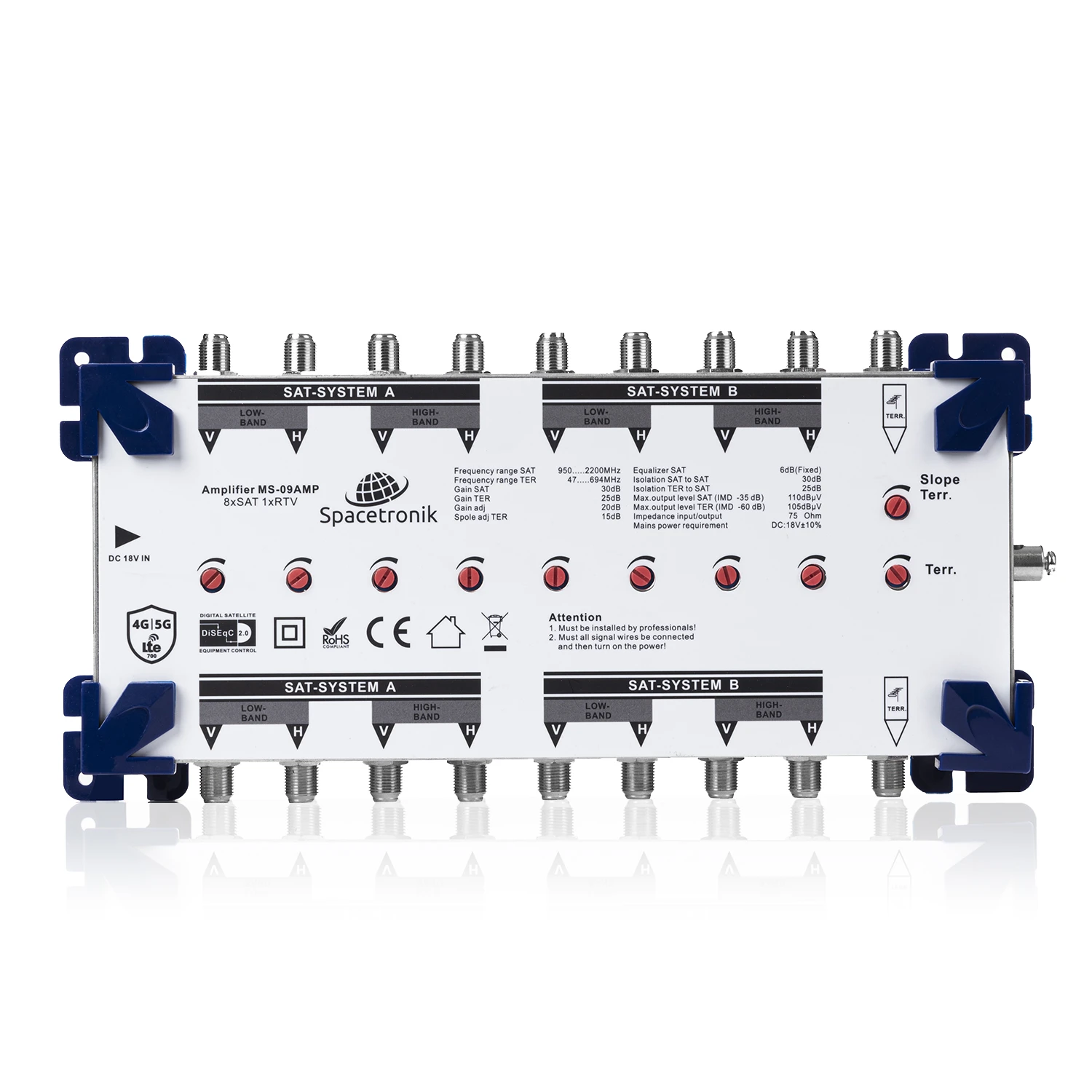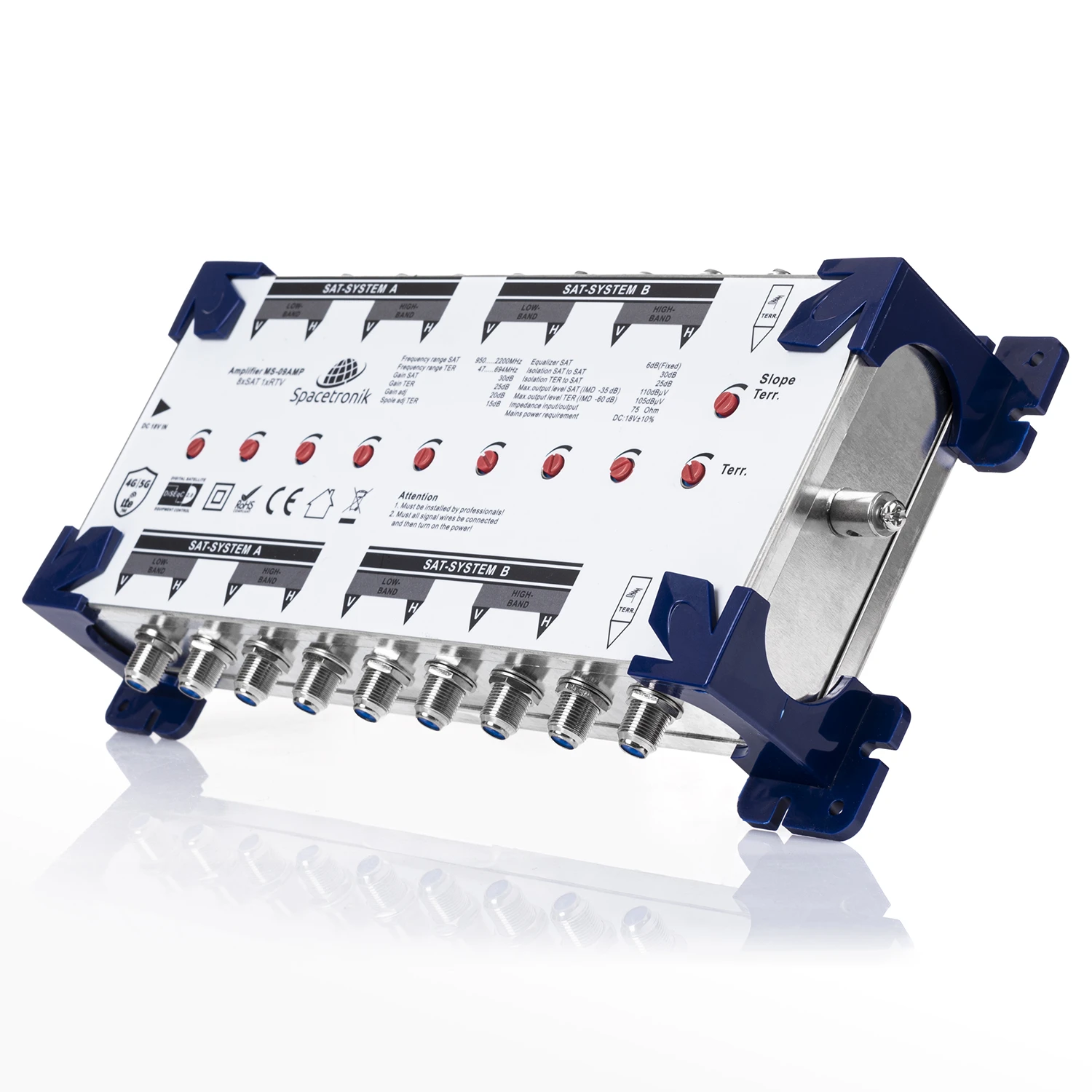 Wzmacniacz kaskadowy na dwie pozycję satelitarne zalecany do instalacji opartej o multiswitche kaskadowe wraz z telewizją naziemną dzięki któremu ustabilizujemy jakość dostarczanego sygnału w sytuacji, gdy należy kaskadować dużą ilość multiswitchy lub istnieją bardzo duże odległości pomiędzy multiswitchami lub multiswitchem a antenami. Zaletą wzmacniacza Spacetronik jest bardzo wysoki maksymalny poziom wyjściowy wzmacniacza w torze SAT jak i DVB-T. Tak dobre parametry, pozwalają montować wzmacniacz w niewielkich odległościach od anteny SAT.