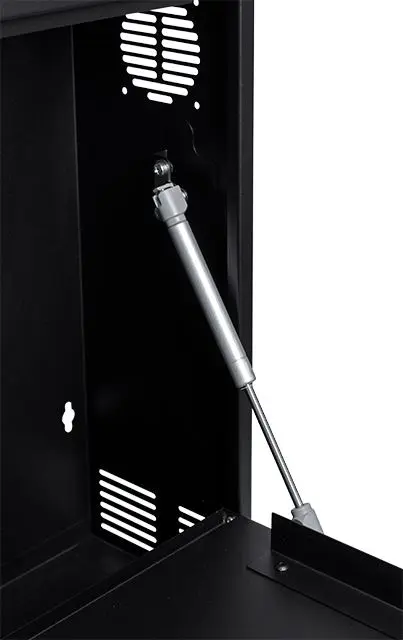 W obudowie zamontowano specjalne siłowniki, które spowalniają otwieranie drzwi obudowy. Poprzez zastosowanie takiego rozwiązania ryzyko uszkodzenia zamontowanego sprzętu jest zminimalizowane, a komfort użytkowania znacznie zwiększony.
