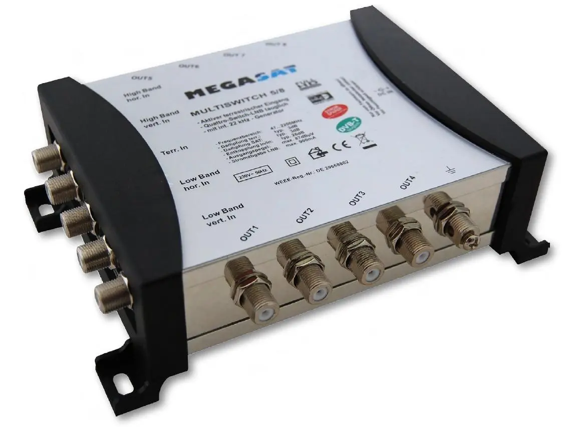 Multiswitch Megasat umożliwiający odbiór sygnału z jednej satelity i połączenie go z sygnałem telewizji naziemnej. Zsumowany sygnał dostępny jest na każdym z 8 wyjść urządzenia. Zastosowanie najnowszych technologii pozwoliło na uzyskanie minimalnych strat oraz wysoki poziom izolacji wzmocnienia na wyjściu urządzenia. W komplecie zasilacz zewnętrzny.