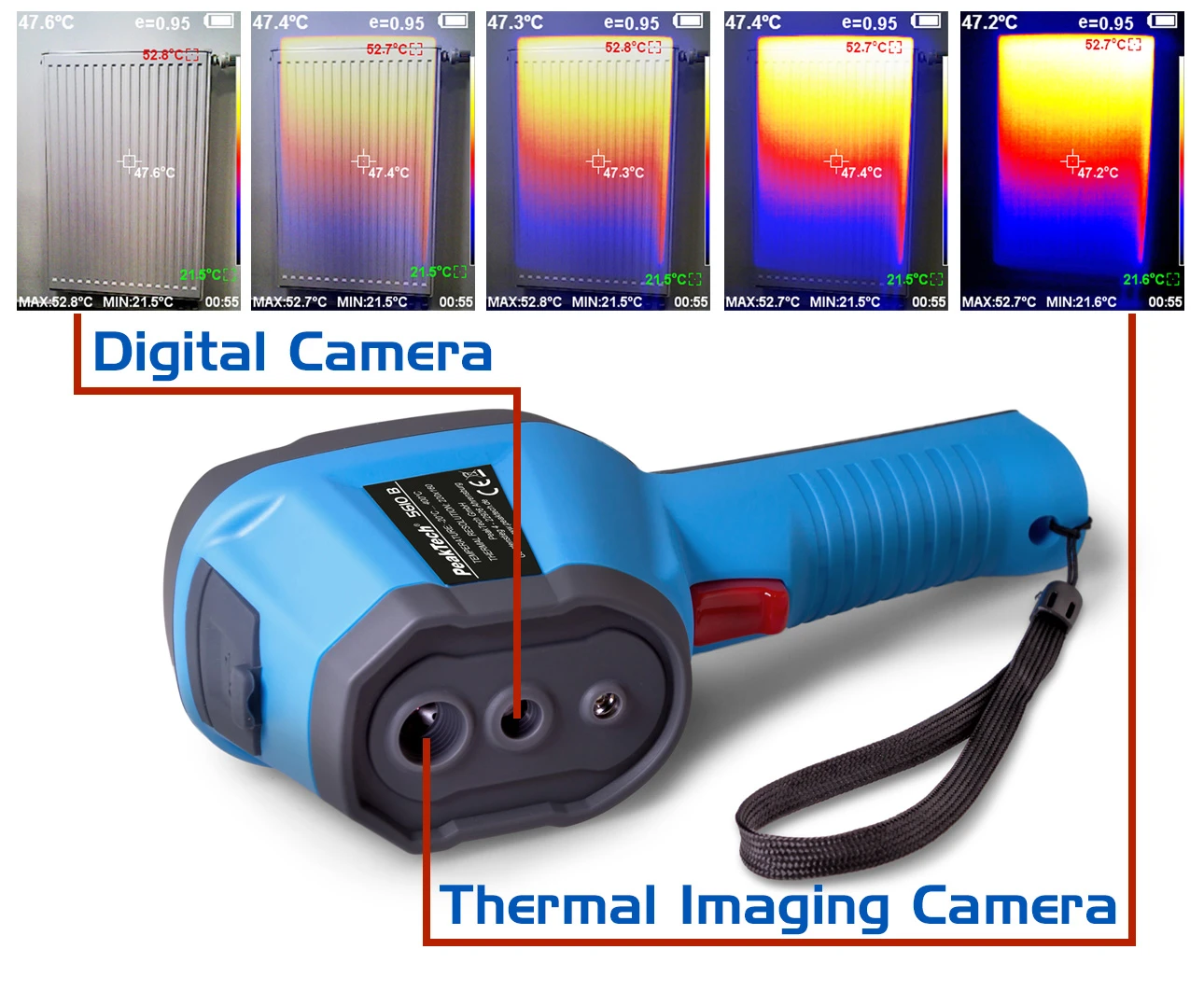 PeakTech 5610 B to wszechstronna kamera termowizyjna o rozdzielczości termowizyjnej 220x160 pikseli, dzięki czemu różnice temperatur są łatwo rozpoznawalne dla każdego użytkownika. Użyj tego nowo opracowanego urządzenia na przykład do wykrywania mostków termicznych w termografii, nieszczelności w instalacjach i systemach rurowych lub śladowych rur grzewczych w ścianach i podłogach. W elektrotechnice ta kamera termowizyjna oferuje możliwość wyszukiwania problemów ze stykami i rezystancji styków, np. w podrozdzielnicach, a tym samym w odpowiednim czasie zapobiegać zagrożeniu pożarowemu. Urządzenie to posiada również pięć różnych palet kolorów termowizyjnych, a także pięć trybów nakładania obrazu lub zdjęcia na obraz termowizyjny, dzięki czemu użytkownik może łatwo zlokalizować źródło błędu w obrazie rzeczywistym lub jednej z nakładek obrazu. Oprogramowanie do analizy jest przechowywane w pamięci wewnętrznej urządzenia i dlatego można je w dowolnym momencie zainstalować na podłączonym komputerze.
