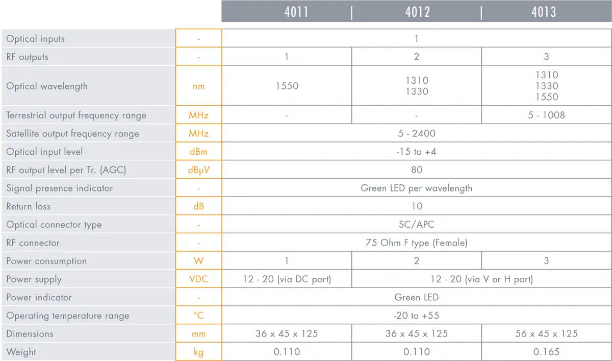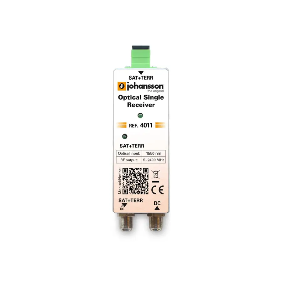 Odbiornik optyczny został opracowany do transmisji sygnałów szerokopasmowych w średnich i dużych systemach światłowodowych. Odbiornik optyczny może przetwarzać jedną, dwie lub trzy długości fali. Nr ref. 4011 (optyczny pojedynczy odbiornik) konwertuje 1550nm do sygnału satelitarnego lub naziemnego.