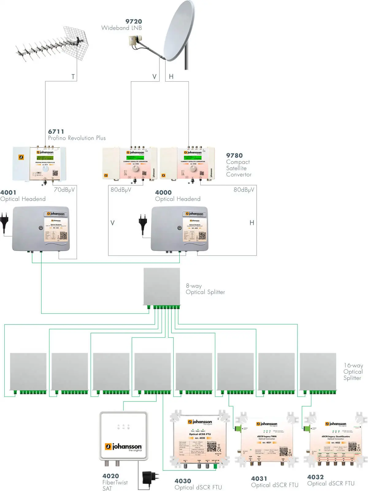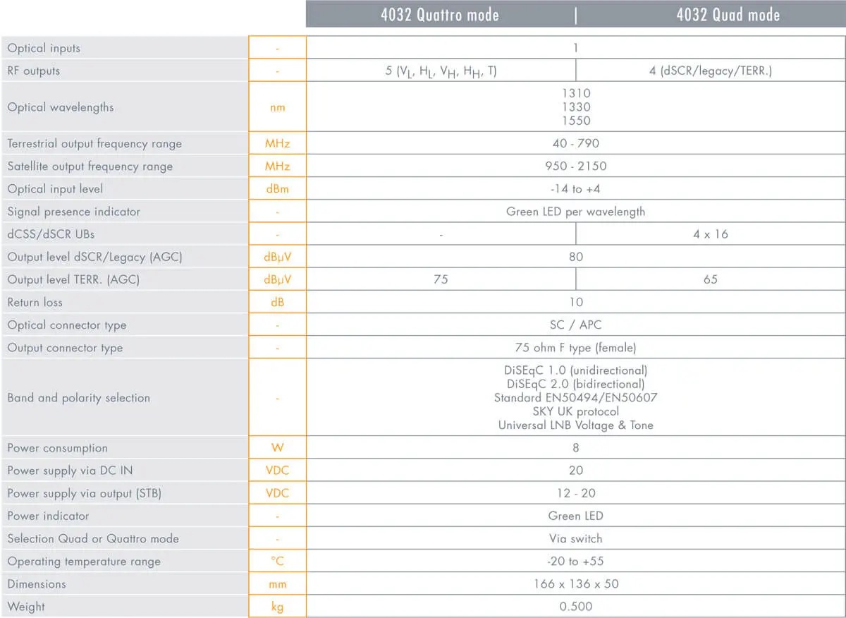 Ten konwerter optyczny dSCR / dotychczasowy Quad / Quattro o wysokiej mocy wyjściowej został opracowany, aby pomóc instalatorom pokonać niską jakość sygnału w instalacjach światłowodowych satelitarnych. Ten łatwy w użyciu produkt może być używany w trybie dSCR, Quad lub Quattro. W trybie Quad 3 długości fal optycznych są konwertowane na 4 x dSCR lub starsze + TERR. W trybie Quattro produkt służy jako wyjście pnia satelitarnego, ponieważ 3 długości fal są konwertowane na VL, HL, VH, HH, TERR.