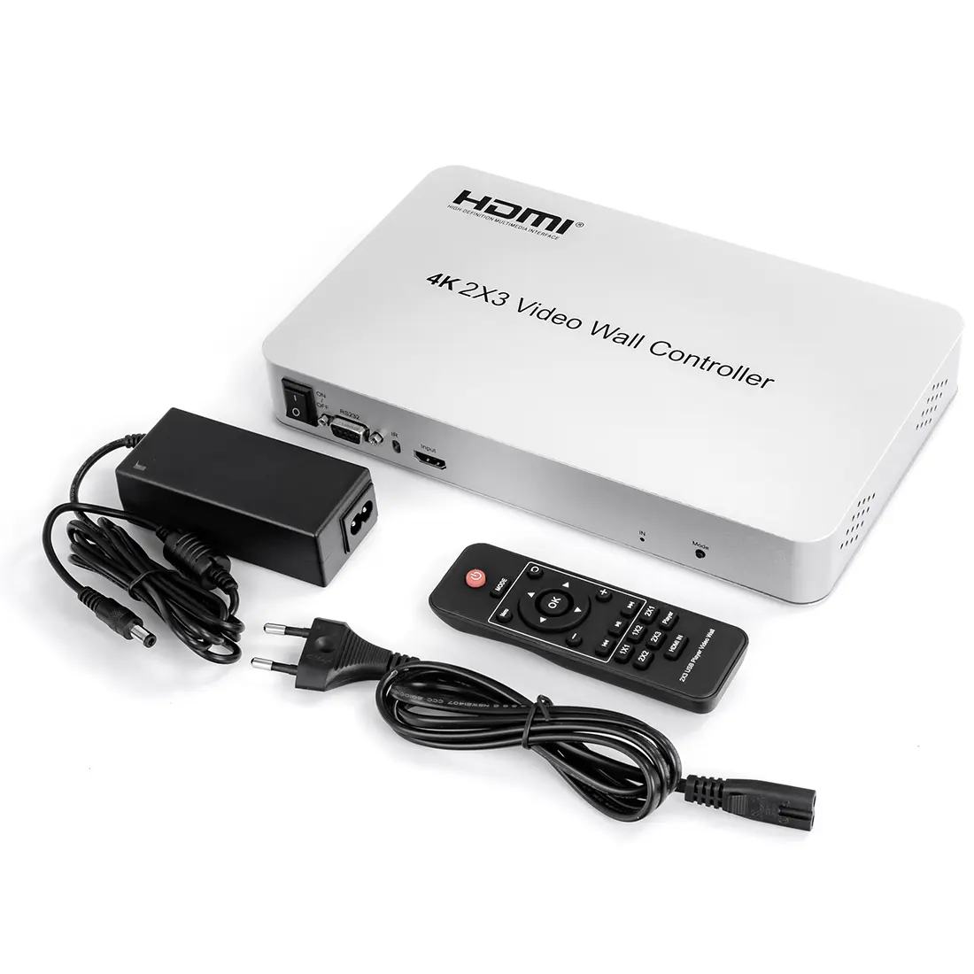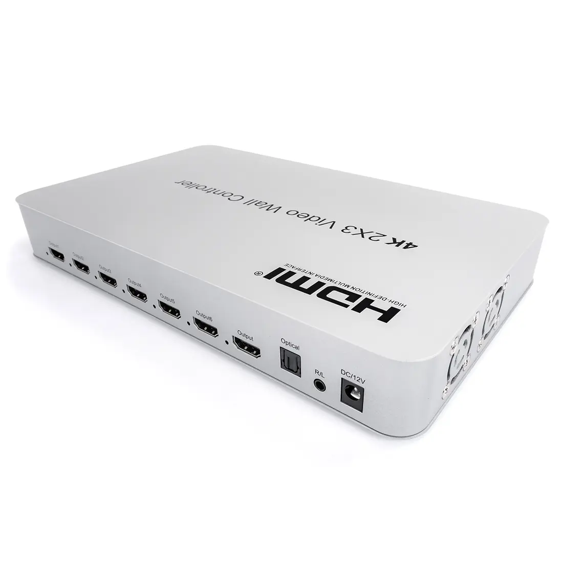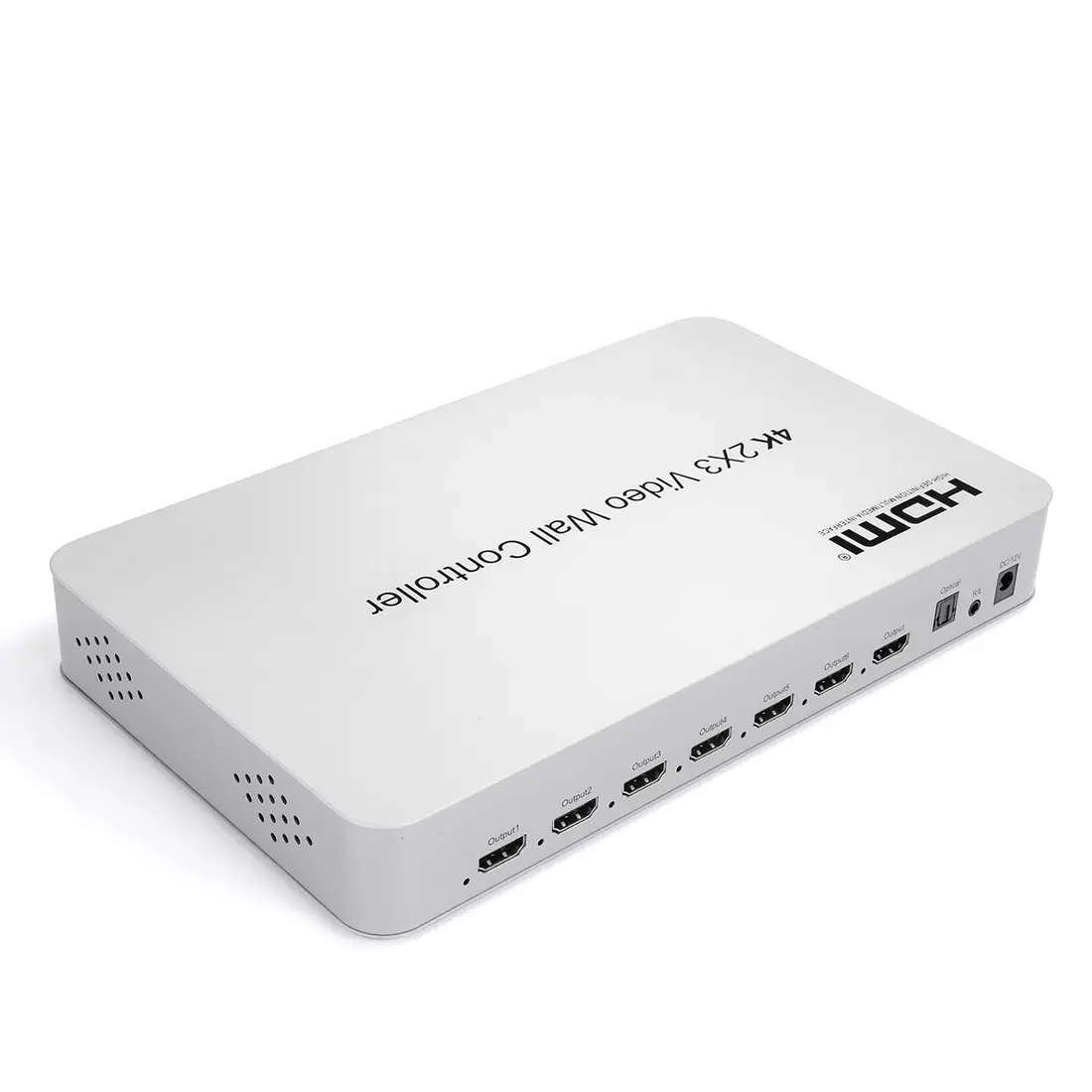 Kontroler ściany wideo 2x3, obsługuje 1- kierunkowe wejście HDMI, 2x wejście USB, 1x wejście Ethernet, slot kart microSD i 6 wyjść HDMI, główną funkcją jest podział pełnego sygnału obrazu HDMI na 6 bloków i przypisanie do 6 wyświetlaczy wideo (takich jak tylna jednostka projekcyjna, telewizor LCD, itp.). Dzięki urządzeniu można stworzyć duży, dynamiczny obraz o wysokiej jakości. Produkt można łączyć kaskadowo, dzięki czemu można rozdzielać obraz na znacznie więcej ekranów. Dodatkową przydatną funkcją kontrolera jest extrakcja audio na wyjście toslink lub jack 3,5mm.