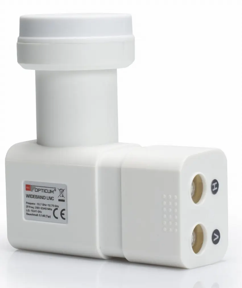 Konwerter satelitarny działający w technologii WideBand w polaryzacji poziomej H i pionowej V. Odbiera sygnał satelitarny w paśmie KU.
