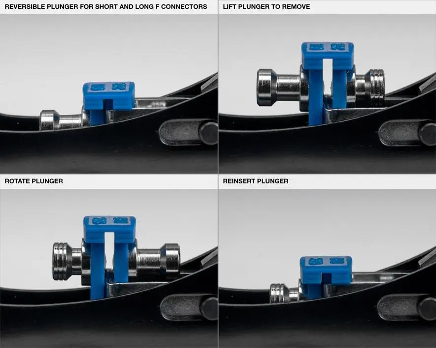 - Skompresowana długość krótkich i długich złączy wynosi odpowiednio 17,9 mm i 20,8 mm, co można stosować z większością złączy F w połączeniu z kablami COAX i RG59 i RG6