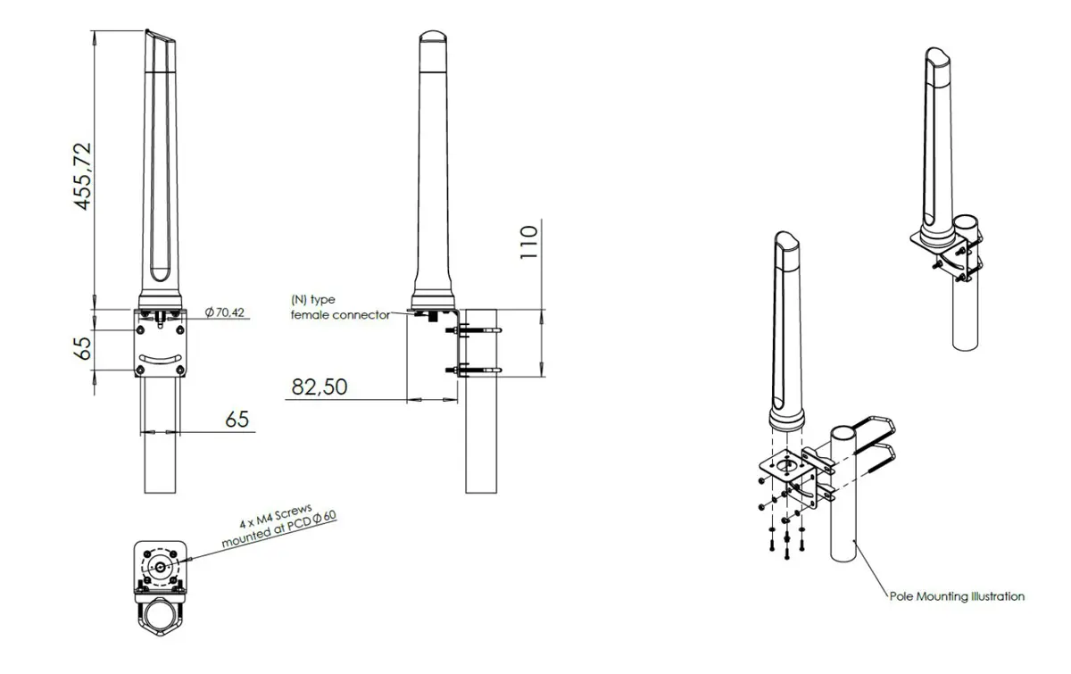 Antena działa w dwóch pasmach częstotliwości Wi-Fi (2,4 GHz i 5 GHz), oferując doskonałe wykorzystanie widma radiowego. Antena ma maksymalny zysk 6dBi w paśmie 2,4GHz i 7,5dBi w paśmie 5GHz, co zapewnia najlepszą wydajność przy niezawodnych połączeniach. Antena obejmuje również pasmo CBRS 3,5 GHz, które będzie wykorzystywane w przyszłych technologiach 5G ze wzmocnieniem szczytowym 7dBi. Obudowa wykonana jest z tworzywa ABS, które jest odporne na uderzenia, kwasy i inne chemikalia, które mogą występować w zakładach przemysłowych. Antena posiada u podstawy złącze żeńskie typu N, które można podłączyć do kabla o żądanym typie i długości.