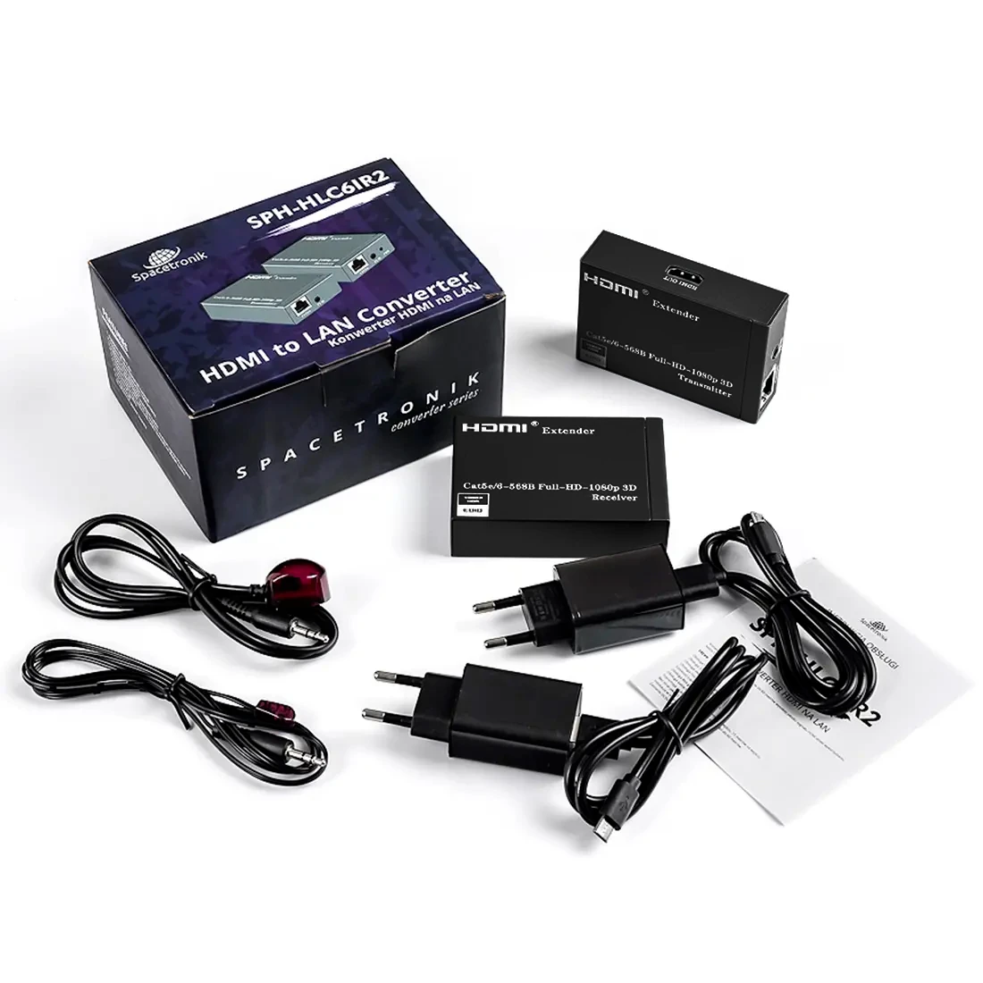 Przedłużacz sygnału HDMI Spacetronik SPH-HLC6IR2. Urządzenie umożliwia podłączenie sygnału wysokiej rozdzielczości (HD) do odbiornika (telewizor, monitor, itp.) wyposażonego w złącze HDMI poprzez skrętkę komputerową kat. 6 lub wyższej. W zestawie znajduję się nadajnik (TX) oraz odbiornik (RX). Dodatkową zaletą urządzenia jest przesyłanie funkcji pilota za pomocą dołączonych podczerwieni IR.
