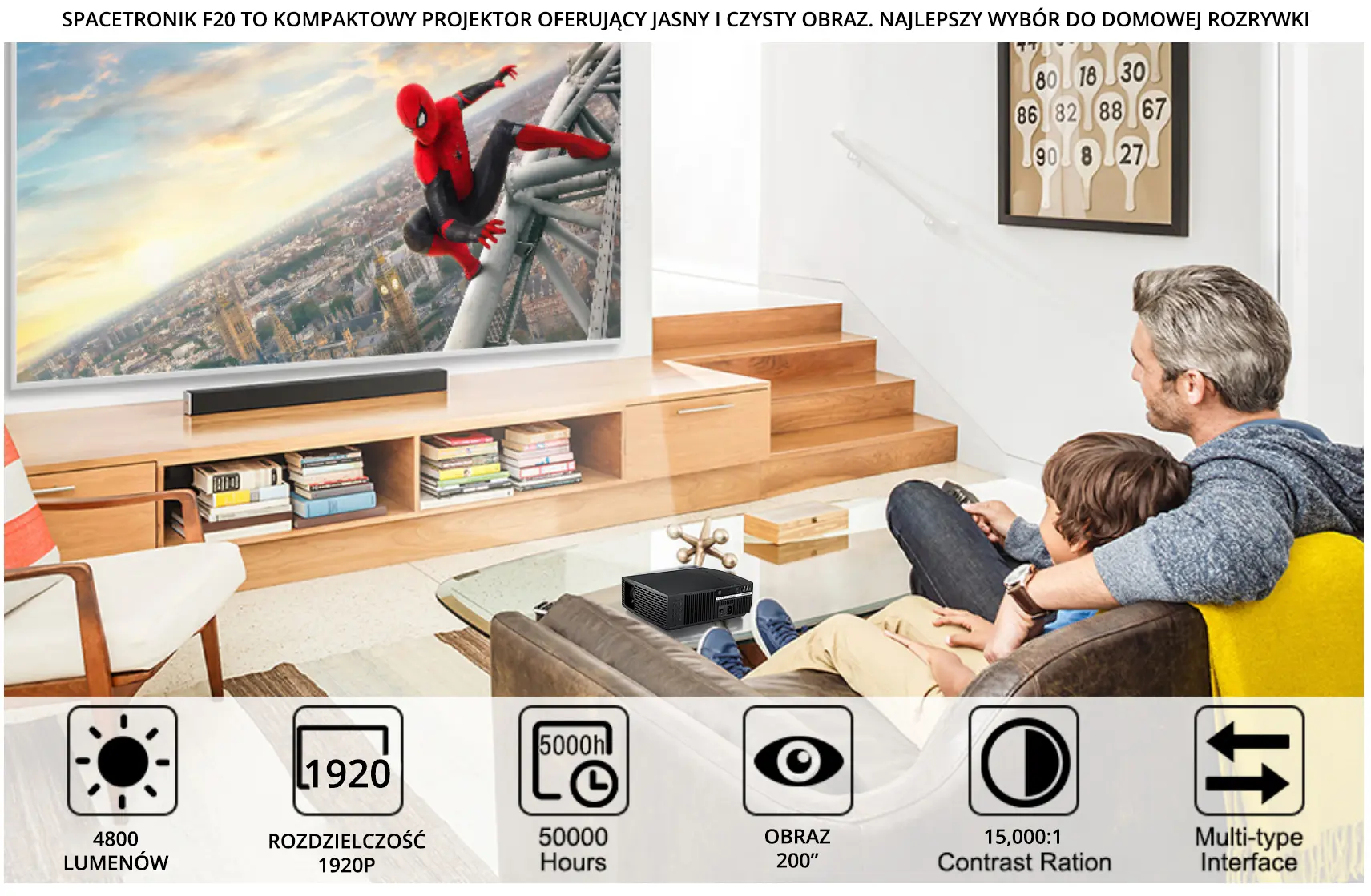 Seria F20 jest idealnym rozwiązaniem dla osób, które poszukują wygodnego sposobu do odtwarzania multimediów. Produkt charakteryzuje się najwyższą rozdzielczością w swojej klasie - 1920x1080px, która gwarantuje naturalny i ostry obraz. Projektor wyróżnia się wysoką jasnością obrazu na poziomie 4800 lumenów. Komfort odbioru wybranych multimediów w zaciemnionych pokojach. Wbudowany głośnik pozwala zaminić salon w małą salę kinową. Spacetronik F20 to kompaktowych wymiarów projektor, który zaspokoi potrzeby wielu użytkowników.