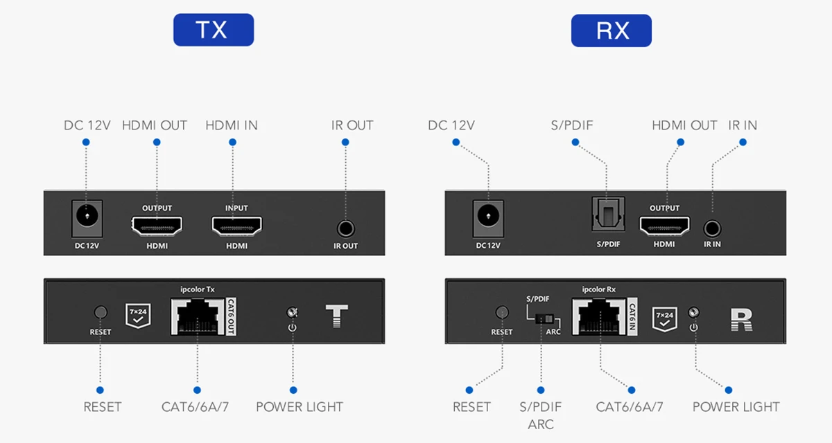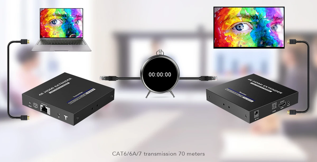 Do transmitera można podłączyć urządzenia poprzez złącze HDMI- np. kamery, PC, DVD, TV Boxy itp. Dodatkowe wyjście HDMI pozwala podłączyć monitor prosto do transmitera. Główny sygnał poprzez kabel CAT6/6A/7 jest wysłany do odbiornika na odległość do 70m. Do odbiornika można podłączyć monitor lub głośnik