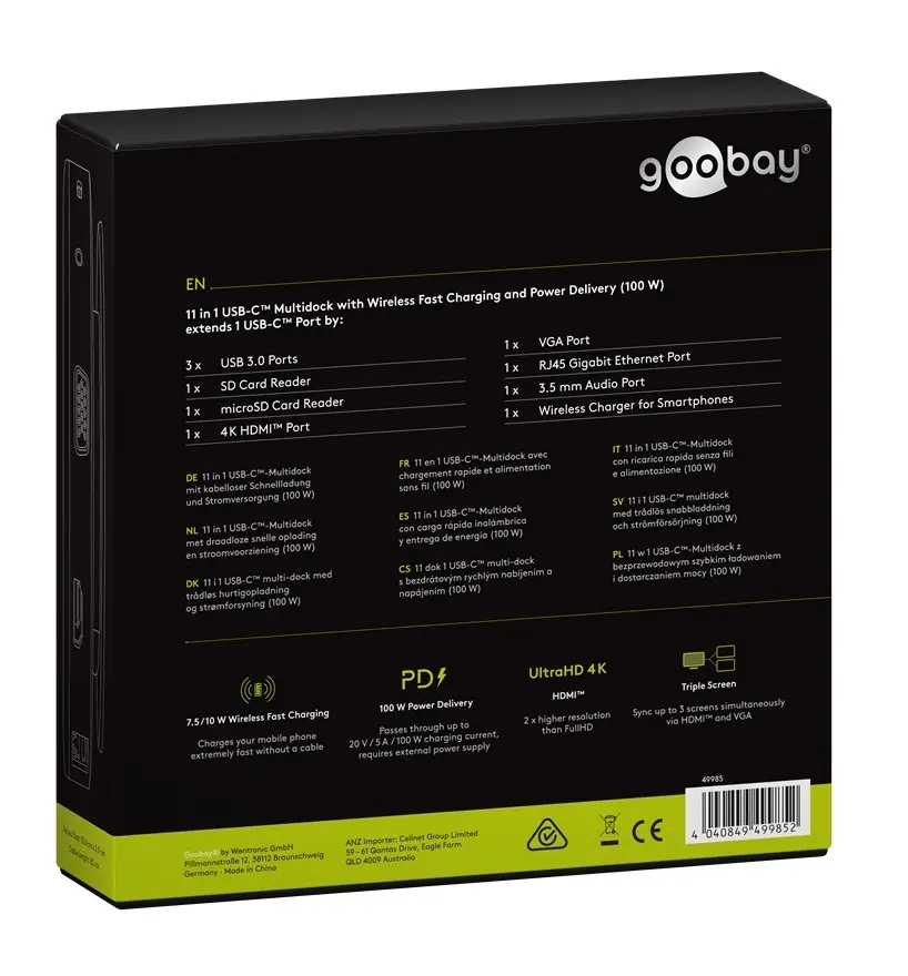 Multiport USB-C Goobay 11w1 | USB-C | USB 3.0 | HDMI & VGA | RJ45 | SD & microSD | AUX | Ładowarka indukcyjna |