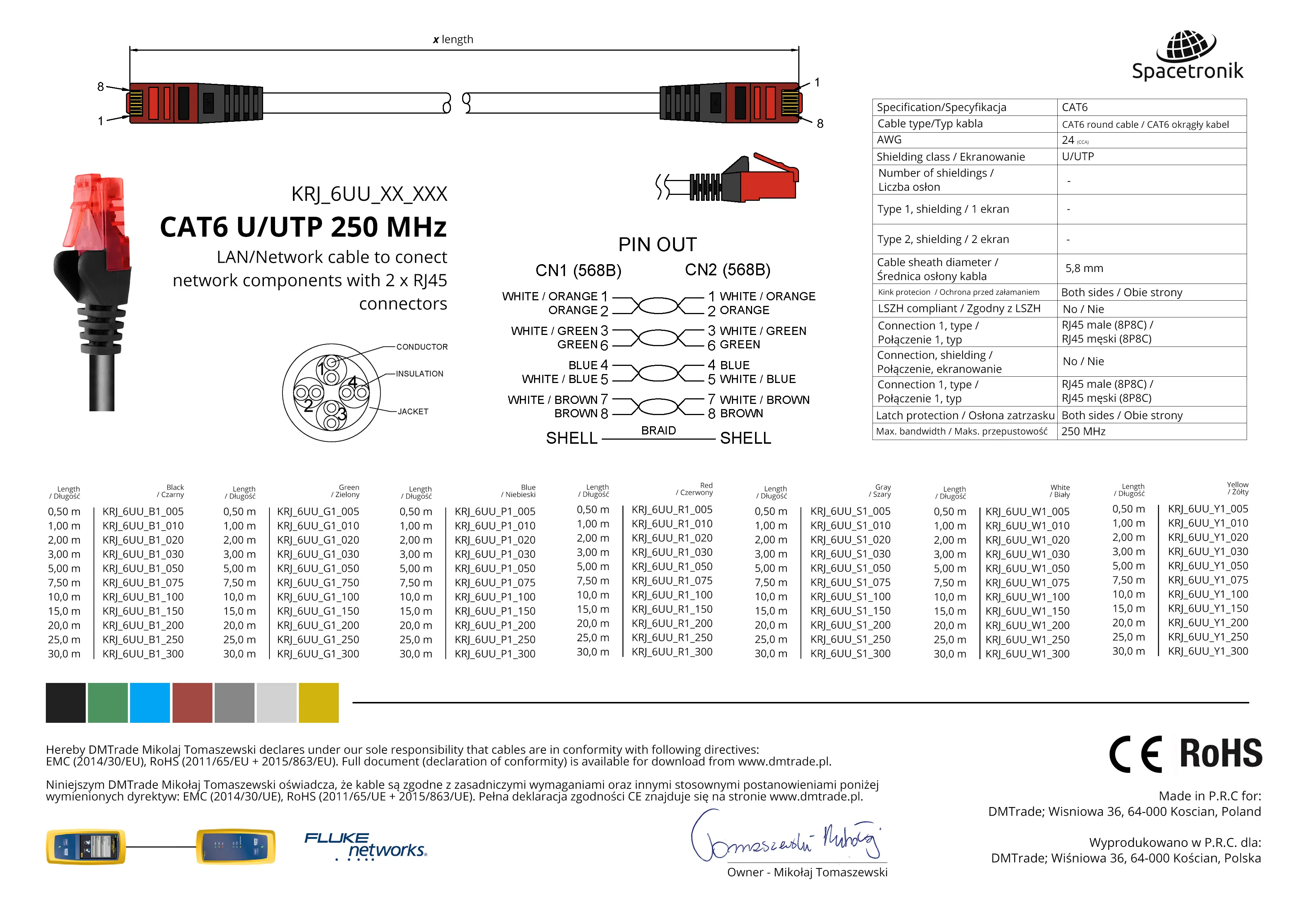 Kabel sieciowy LAN zakończony obustronnie złączami RJ-45. Kabel patchcord (nazywany także krosowym) służący do połączeń gniazda abonenckiego z urządzeniami sieciowymi, m.in. routerami, switchami, a także bezpośrednio z kartą sieciową komputera. Kategoria kabla (CAT6) określa funkcjonowanie w zakresie częstotliwości do 250 MHz.