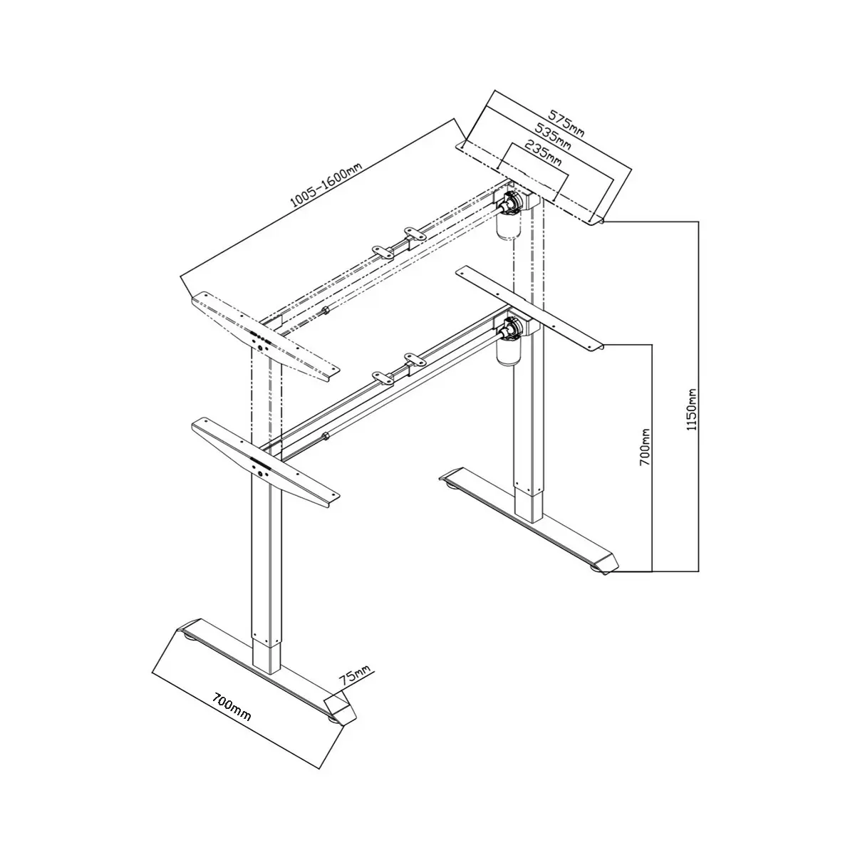 Wszechstronna rama elektrycznego stelaża oprócz regulacji góra/dół pozwala na ręczną regulację horyzontalną (w bok). W łatwy sposób rozszerzysz konstrukcję pod wymiar swojego blatu. Sugerowane wymiary blatu: 1200-2000 mm (szerokość), 600-800 mm (głębokość).
