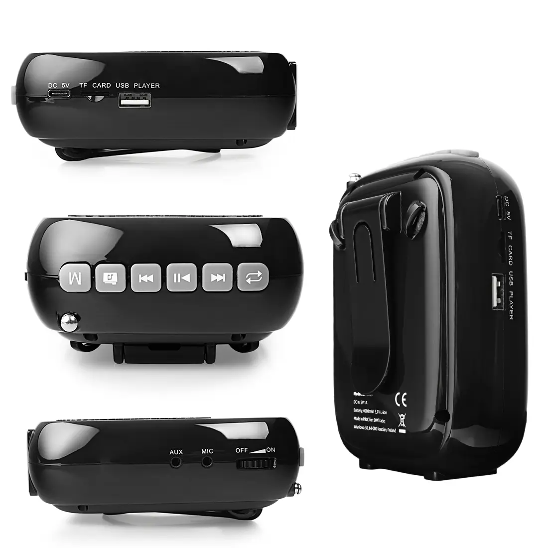 Urządzenie obsługuje karty pamięci i nośniki pamięci USB, np. pendrive. Może powtarzać pojedynczy utwór, zapętlać cały album i przełączać utwory. Urządzenie posiada wejście audio AUX 3,5 mm, co pozwala na zastosowanie wzmacniacza głosu jako głośnik komputera lub głośnik mobilny np. do telefonu komórkowego. W identycznym celu można wykorztsać port micro USB. Idealne narzędzie pracy dla nauczyciela, trenera, piosenkarza, przewodnika. Sprawdzi się idealnie w każdych warunkach - podczas profesjonalnego szkolenia, treningu lub wycieczki szkolnej. Dodatkowo ten model posiada funkcję nagrywania, dzięki czemu może działać jak dyktafon.