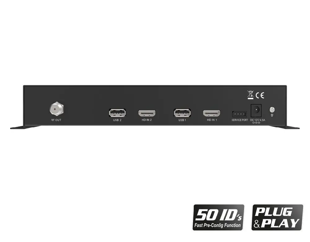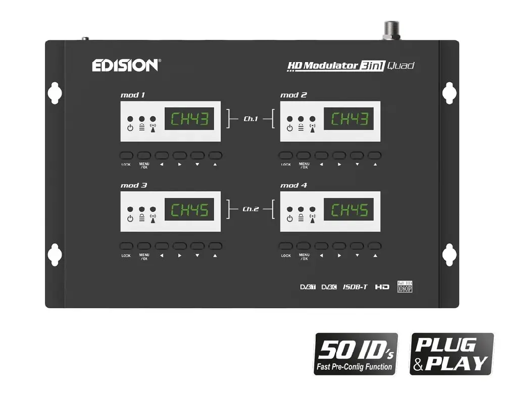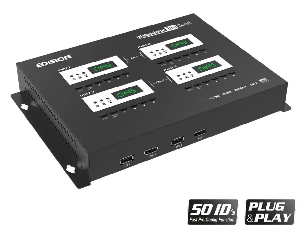 Cyfrowy modulator HDMI 3w1 QUAD jest niezwykle elastyczny i może konwertować do 4x sygnałów HDMI (np. z odbiorników satelitarnych, tunerów naziemnych DVB-T2, komputerów PC, notebooków, kamer monitorujących, odtwarzaczy DVD/Blu-ray itp.) na 2x MUX DVB-T, DVB-C lub ISDB-T MPEG4. Cyfrowe sygnały wejściowe HD do 1080p są tutaj w pełni zachowane, kanały wyjściowe RF mogą być bardzo łatwo odbierane przez odbiorniki HDTV lub telewizory z wbudowanym tunerem DVB-T, DVB-C lub ISDB-T MPEG4. Oprócz doskonałej jakości sygnału w połączeniu z niezawodnością, Quad Modulator oferuje łatwą i szybką konfigurację z funkcją Pre-Config, dzięki czemu instalacja jest bardzo szybka PLUG & PLAY!