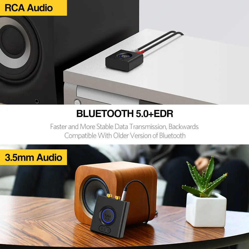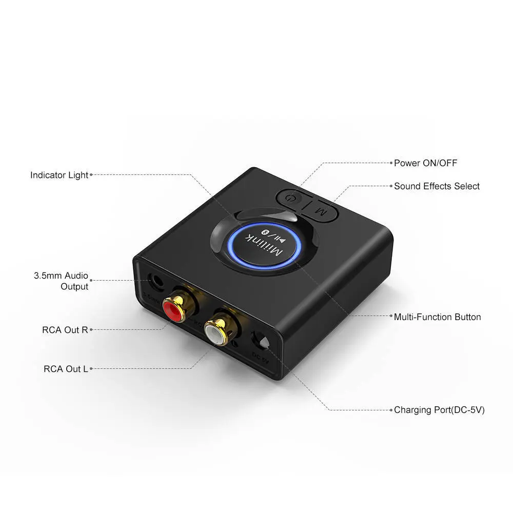 Adapter MiiLink Bluetooth wyposażony jest w najnowszą technologię Bluetooth 5.0, która umożliwia bezprzewodowe przesyłanie dźwięku z urządzeń obsługujących technologię Bluetooth do istniejącego domowego lub samochodowego zestawu stereo, głośników lub słuchawek. Ciesz się bezprzewodową muzyką bez komplikacji przez jakiekolwiek przewody lub kable.