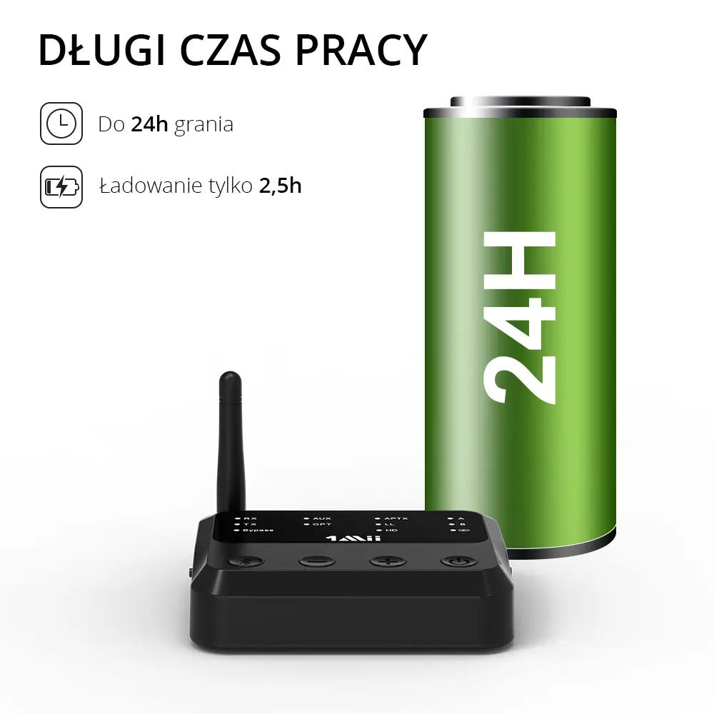 Adapter audio Bluetooth możesz używać z zasilaczem lub bez, ponieważ posiada wbudowaną baterię. W pełni naładowana w ciągu 4,5 godziny pozwala grać w trybie TX do 18 godzin, a w trybie RX do 20 godzin. To przenośny nadajnik / odbiornik Bluetooth dalekiego zasięgu.