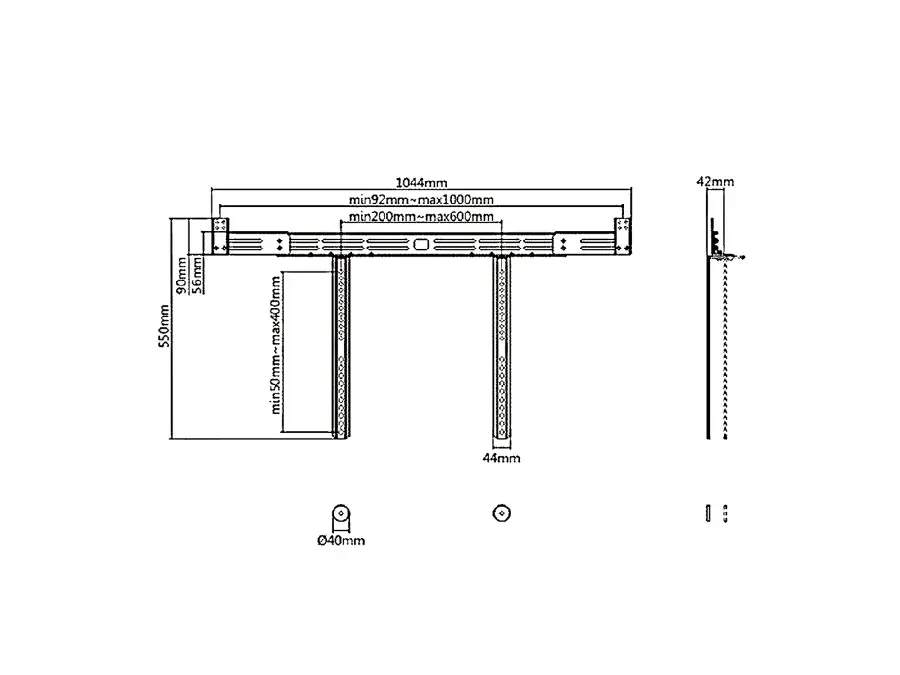 - VESA: 200x100, 200x200, 200x300, 300x300, 300x400, 400x400, 600x300, 600x400 mm