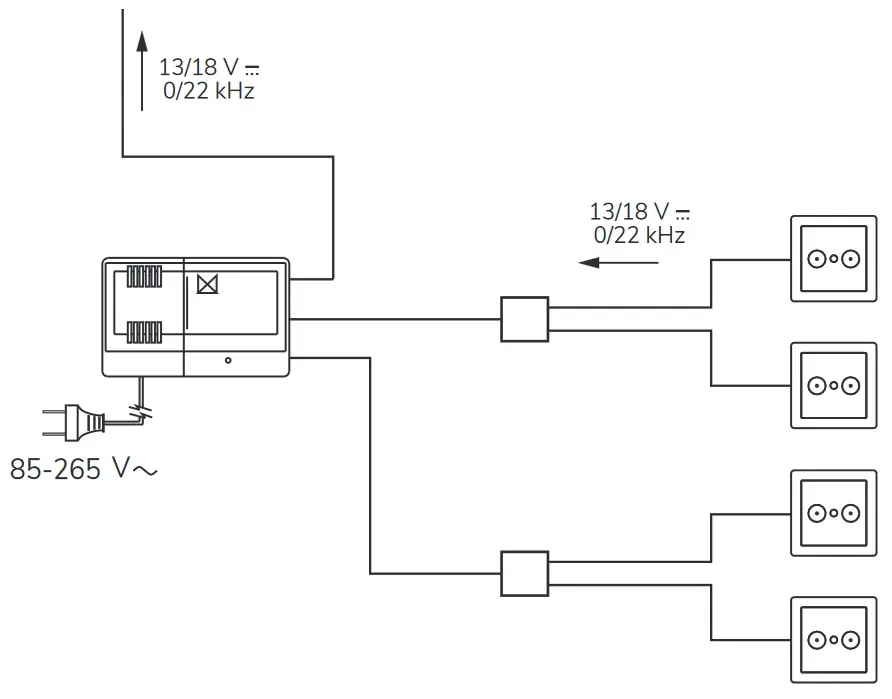 Zasilacz do wzmacniacza masztowego z multipleksowaniem SAT. Zasilanie napięciem 12Vdc. W przypadku odebrania sygnału sterującego z konwertera zasila on zarówno wzmacniacz, jak i konwerter sygnałem sterującym pochodzącym z odbiornika SAT. Napięcie wyjściowe jest podawane do kabla koncentrycznego w celu zasilania wzmacniacza i konwertera. Sygnał pochodzący z anteny rozprowadzany jest na jej dwa wyjścia. Ochrona przed przeciążeniami i zwarciami. Idealne zastosowanie do instalacji telewizji naziemnej i satelitarnej, w których stosowane są wzmacniacze masztowe z multipleksacją SAT