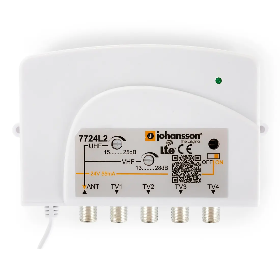 Budynkowy wzmacniacz naziemny DVB-T/T2 Johansson VHF-UHF 7724L2 z filtrem LTE/5G1 wejście (40-320 + 470-694 MHz) / 4 wyjścia / wzmocnienie VHF: 13-28 dB / wzmocnienie UHF: 15-25 dB