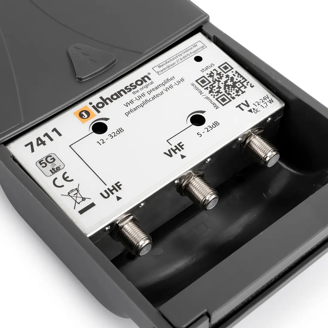 Przedwzmacniacz antenowy VHF-UHF Johansson 7411Regulowany zakres wzmocnienia: VHF: 5-23dB / UHF: 12-32dB (K. 21-48 LTE 5G)