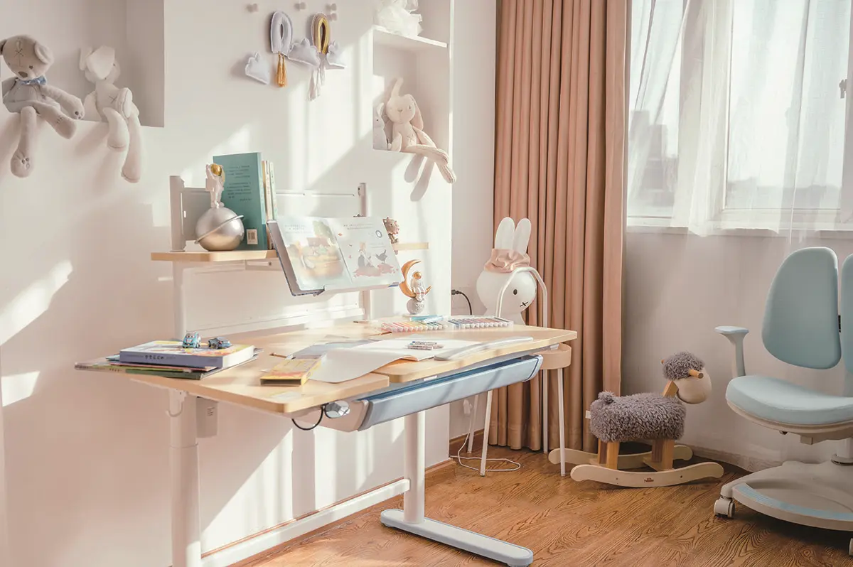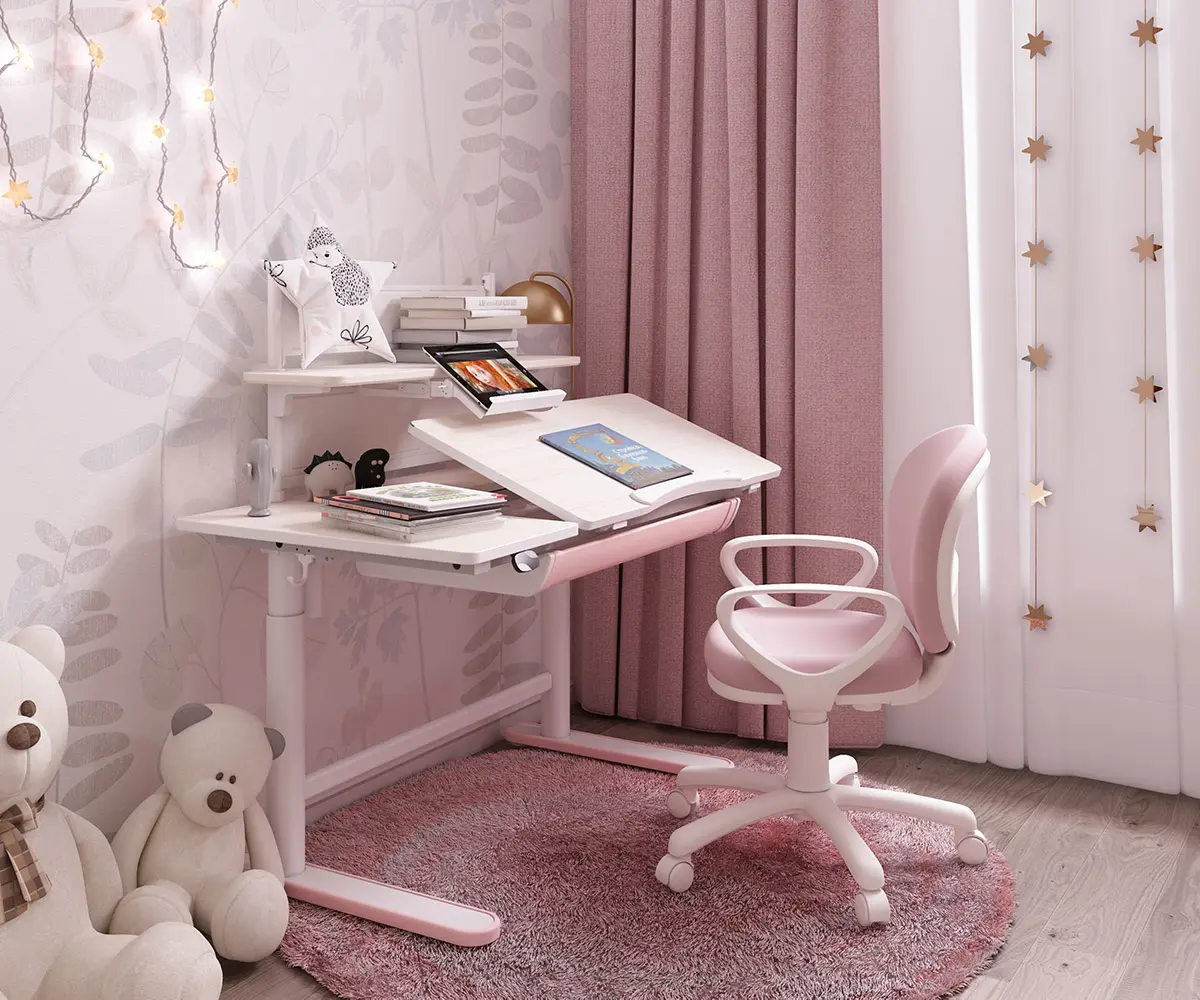 Zyskaj więcej przestrzeni na biurku, dokładając opcjonalną półkę na biurko SPB-116T kompatybilną z dziecięcym biurkiem regulowanym elektrycznie Spacetronik XD SPE-X116.
